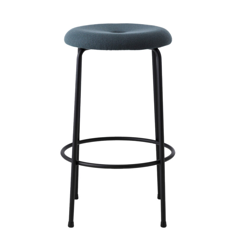 Barstool with upholstered seat and a powder coated or chromium plated tubular steel frame.