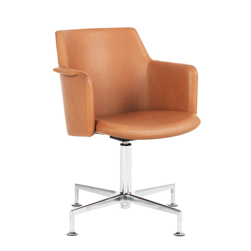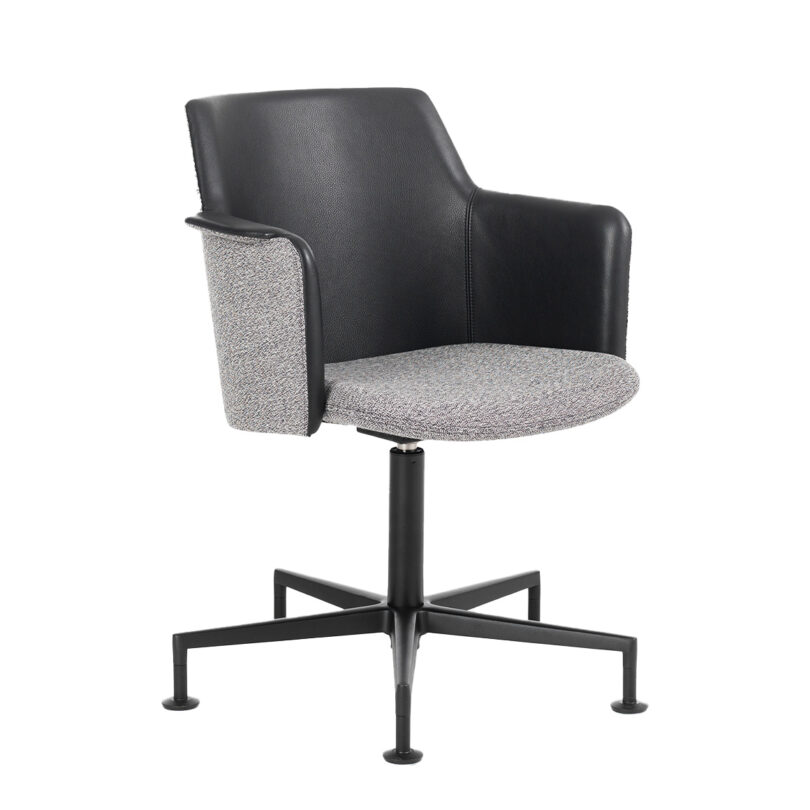 Armchair on a 360° swivel chrome or black powder coat base on a five star base. Upholstered seat and back. With Tilt and height adjustable