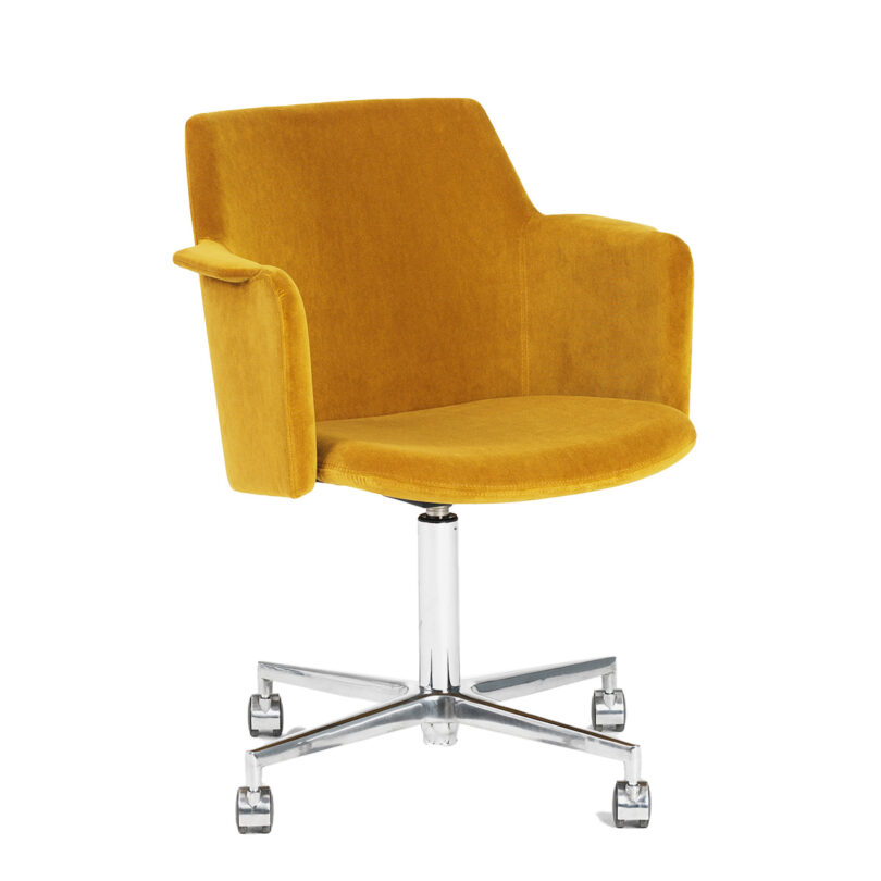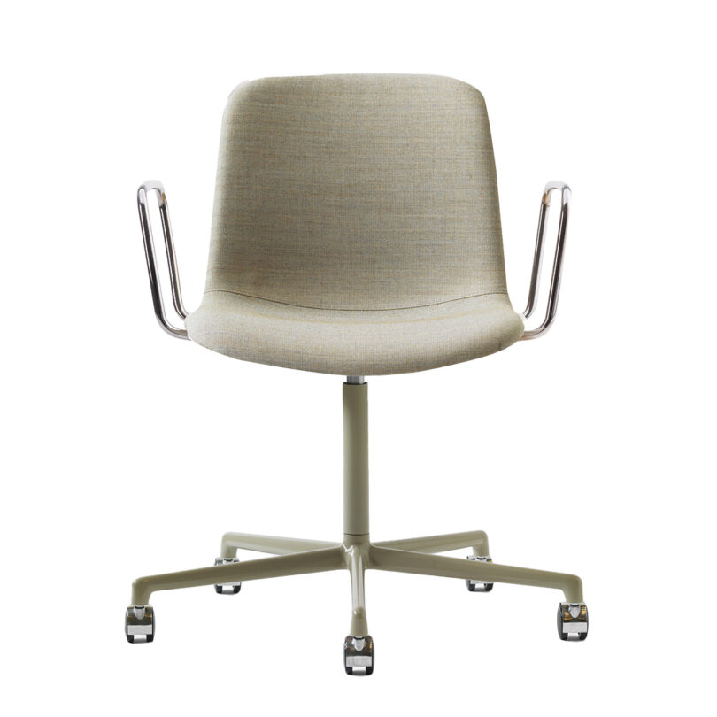 Armchair on a 360° swivel chrome or black powder coat base on a five star caster base. Upholstered seat and back.