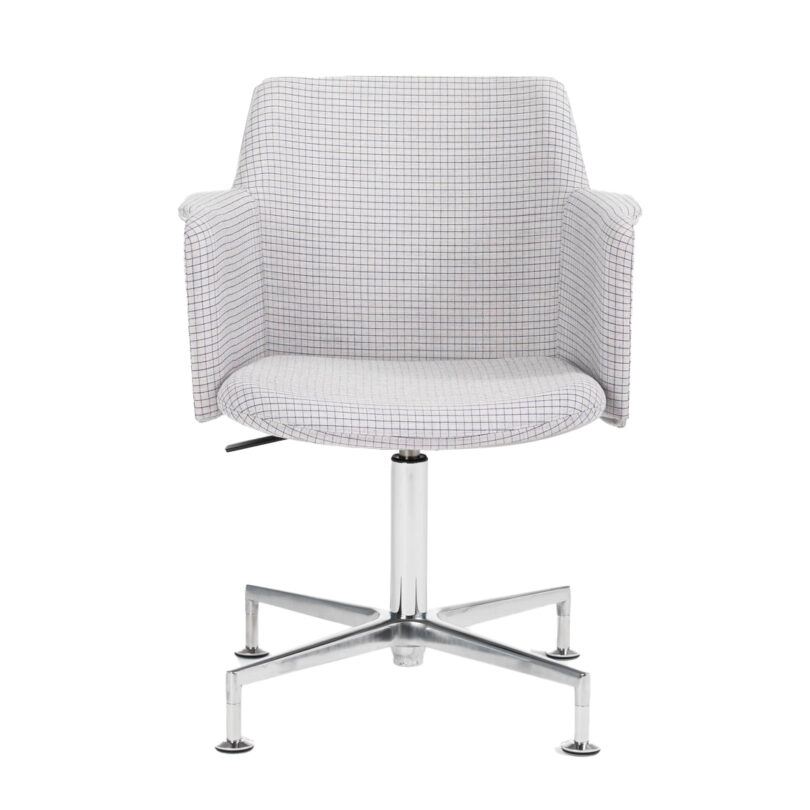 Armchair on a 360° swivel chrome or black powder coat base. Upholstered seat and back. With Tilt and height adjustable