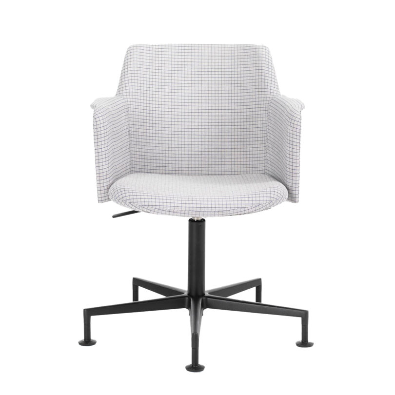 Armchair on a 360° swivel chrome or black powder coat base on a five star base. Upholstered seat and back.