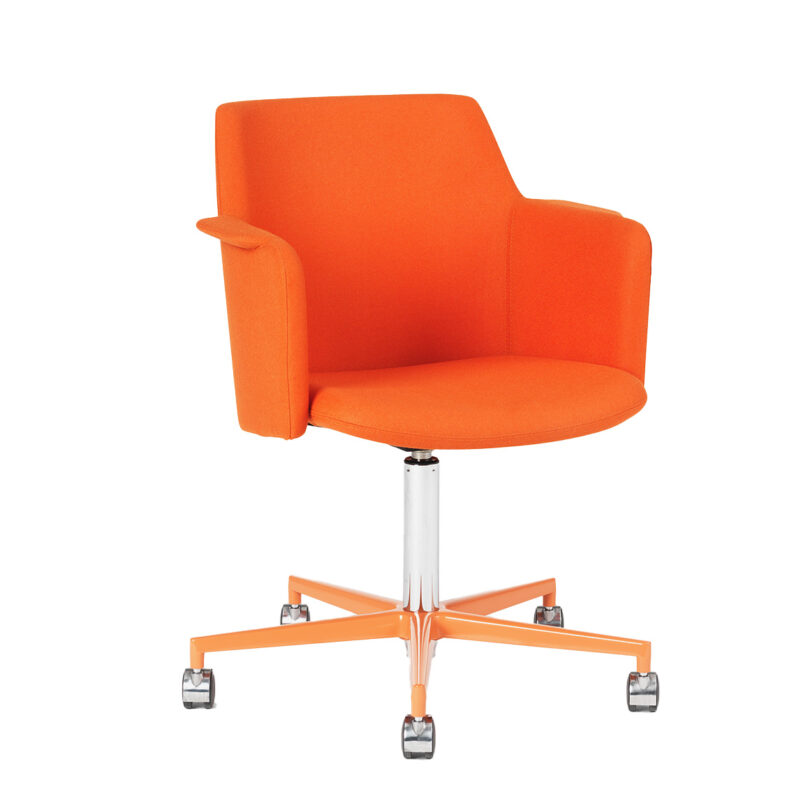 360° swivel armchair with upholstered seat and back on a powder coated or chromium plated tubular steel frame 5 leg frame with casters.