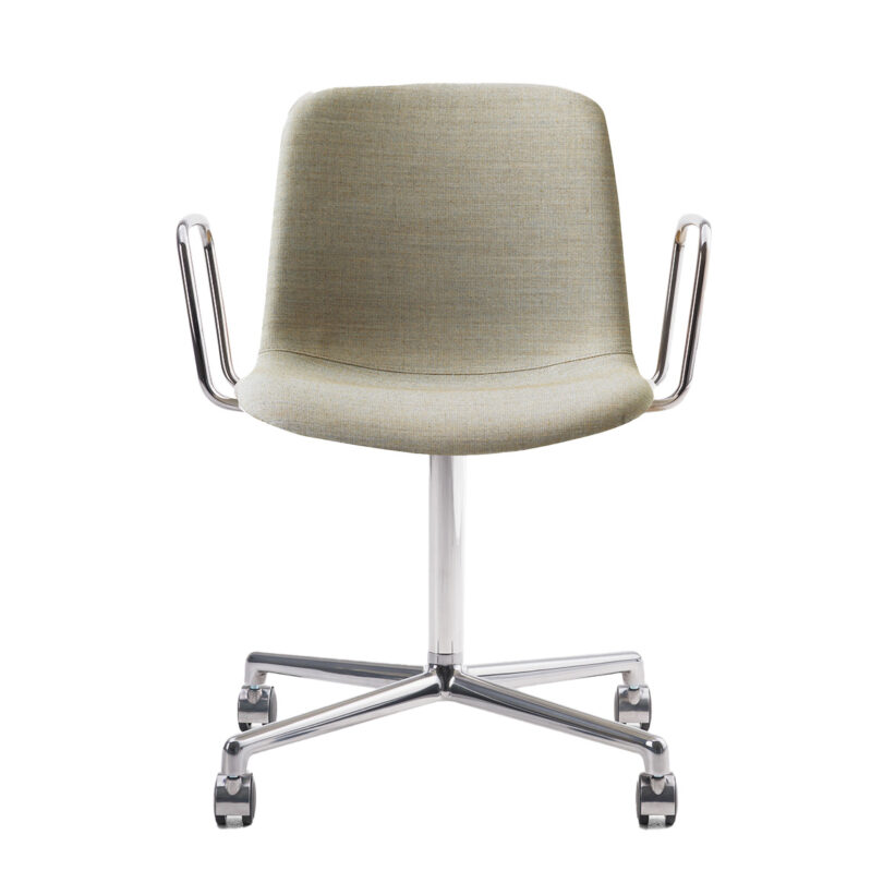 360° swivel armchair with fully upholstered recycled polypropylene seat on a recycled aluminium 5 foot base with casters. Tested to 360 lbs weight load.
