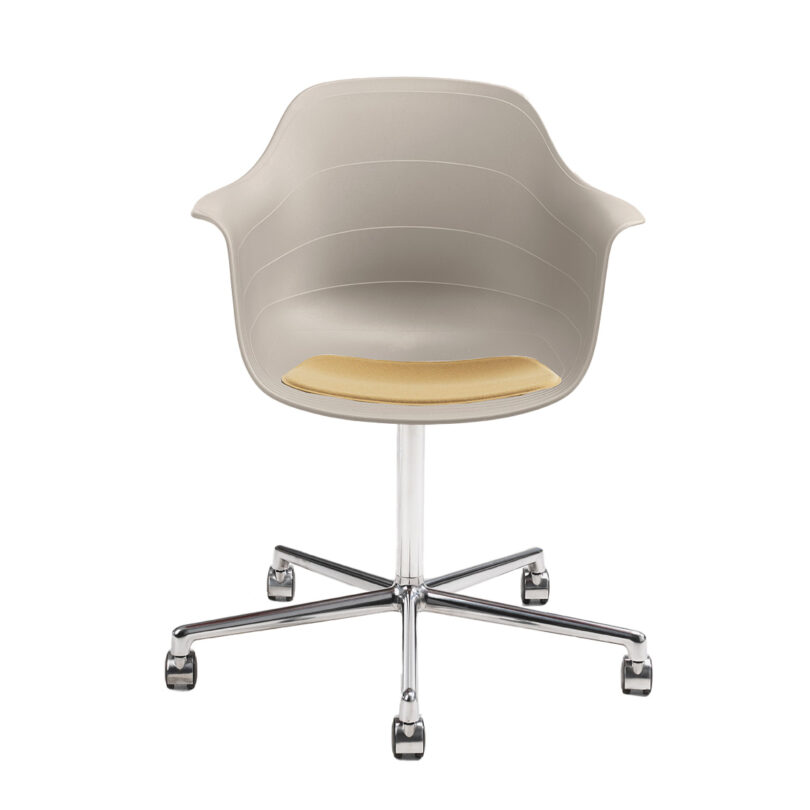 360° swivel armchair with recycled polypropylene seat on a recycled aluminium 5 foot base with casters. With upholstered seat pad