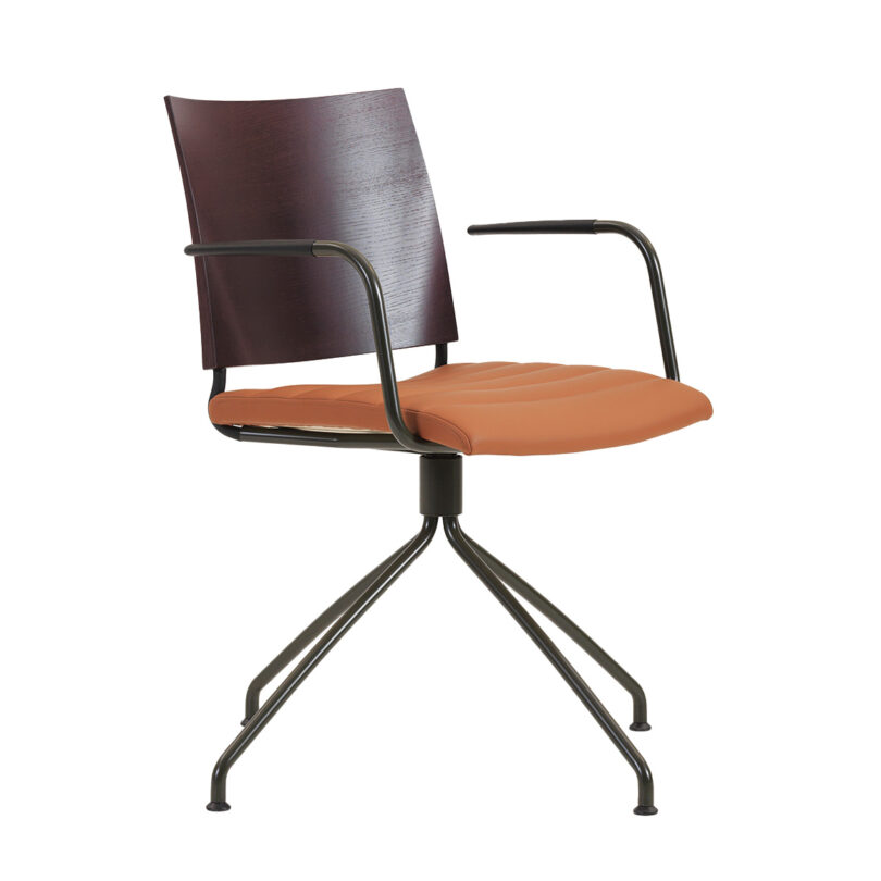 360° swivel armchair with upholstered seat and wooden back on a powder coated or chromium plated tubular steel frame 5 leg frame with casters