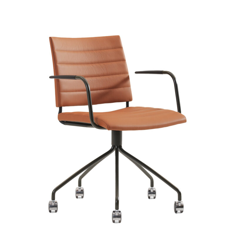 Armchair on a 360° swivel chrome or black powder coat base on casters. Upholstered seat and back.