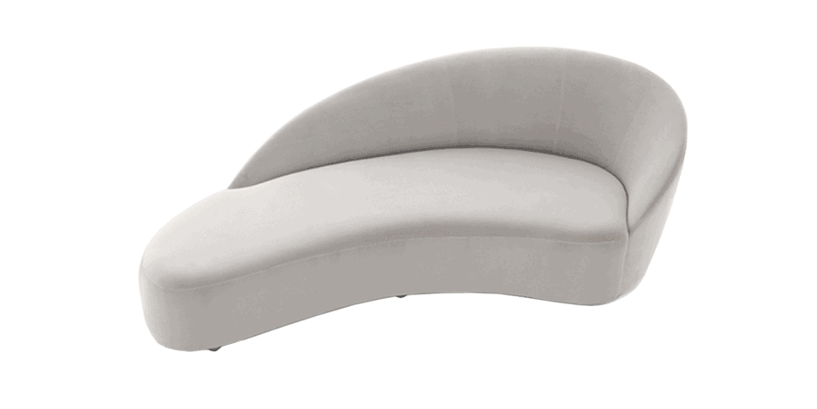 Fully upholstered backless sofa with rounded black colored plastic feet.