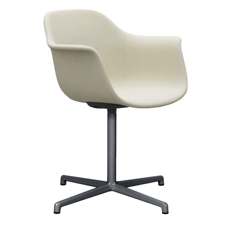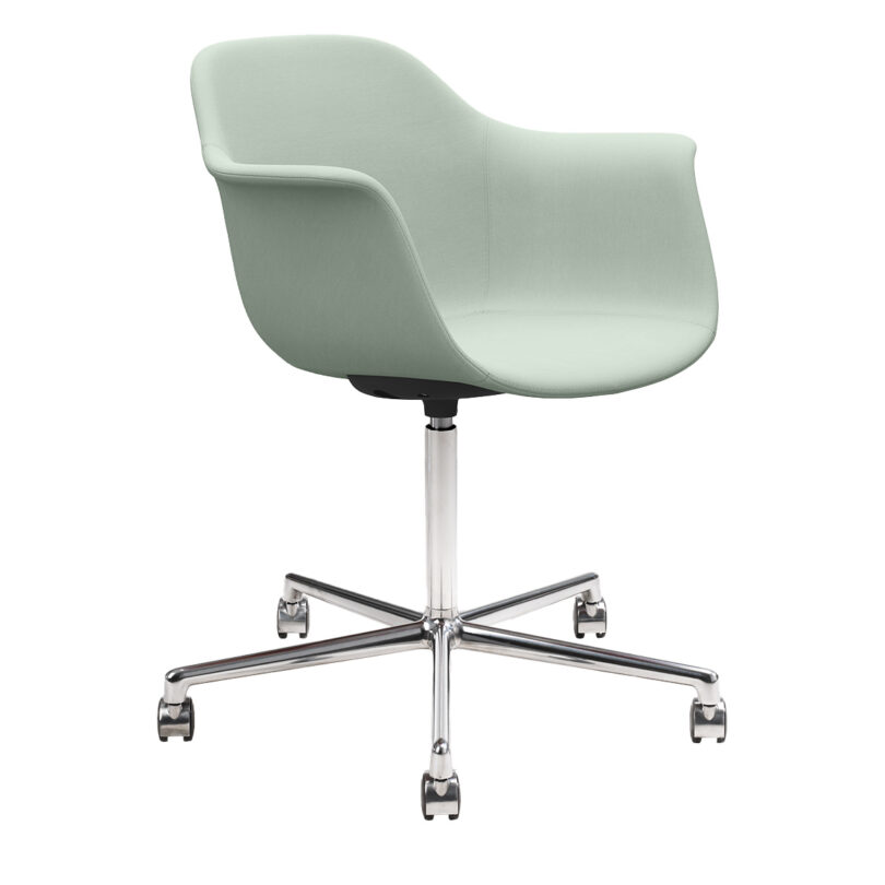 360° swivel armchair with recycled polypropylene seat on a polished aluminum 4 foot base. With upholstered seat pad, adjustable height and casters.Tested to 360 lbs weight load.