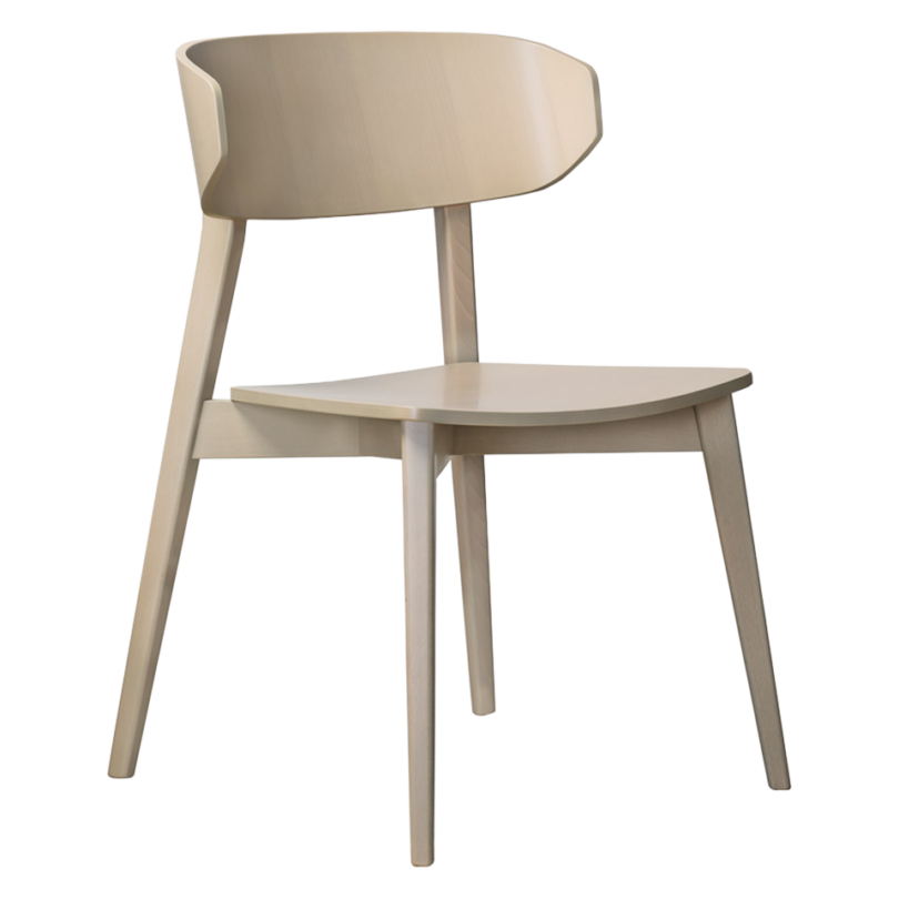 Chair on a solid beech wood frame with curved backrest. Stackable up to five chairs.