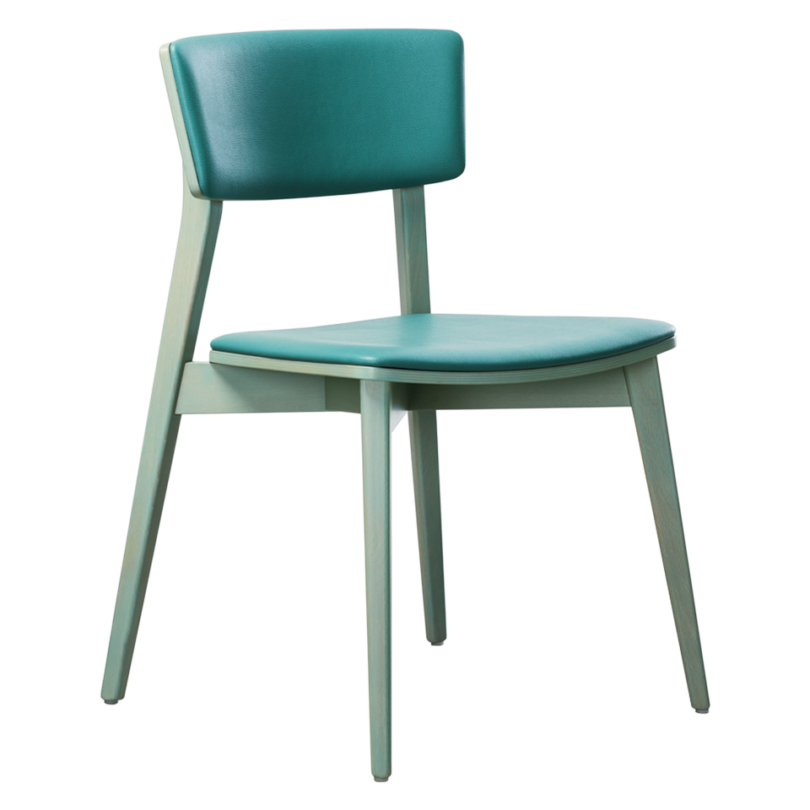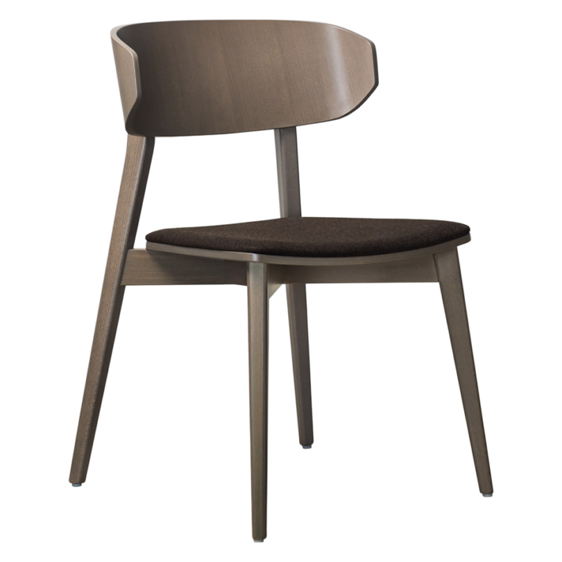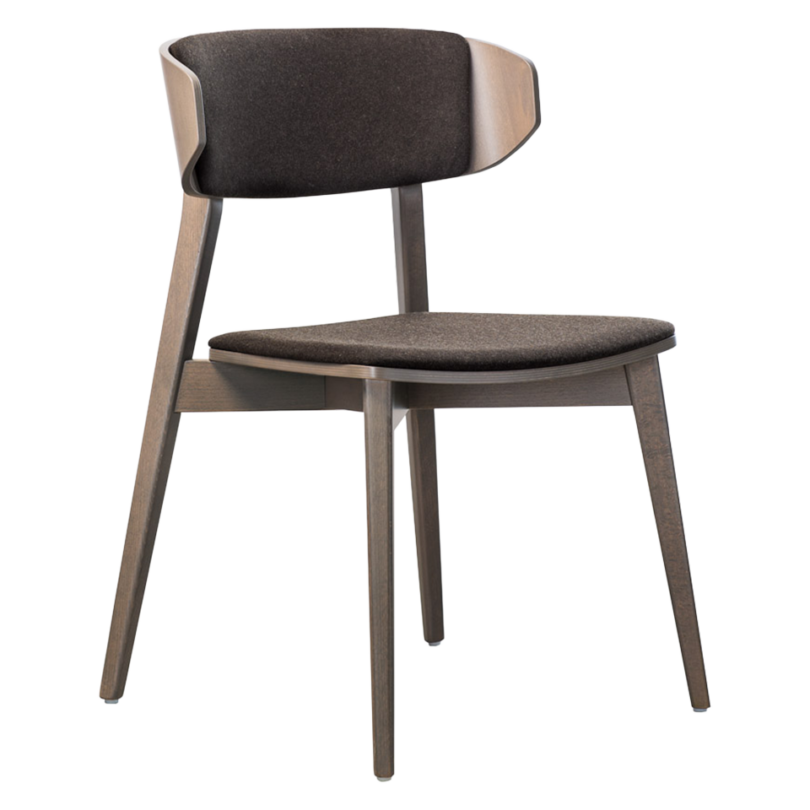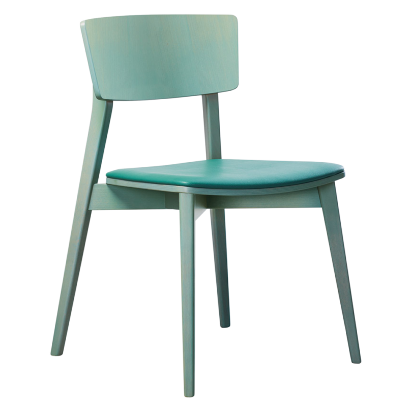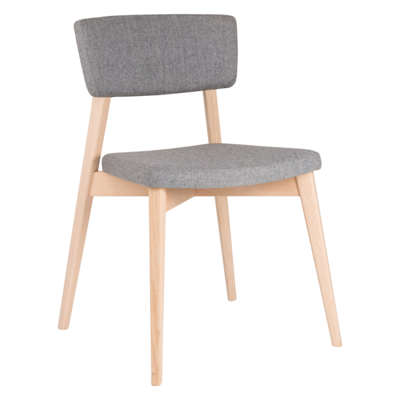 Chair with upholstered seat panel on a solid beech wood frame with curved backrest. Stackable up to five chairs.