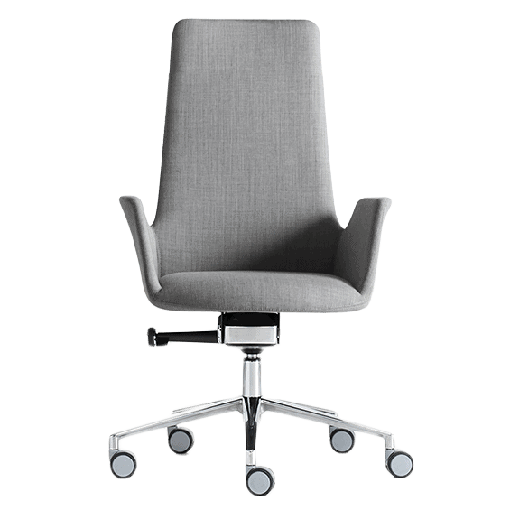 Fully upholstered, high back arm chair with 5-spoke polished aluminum base on casters. Height adjustable with swivel and tilting mechanism.