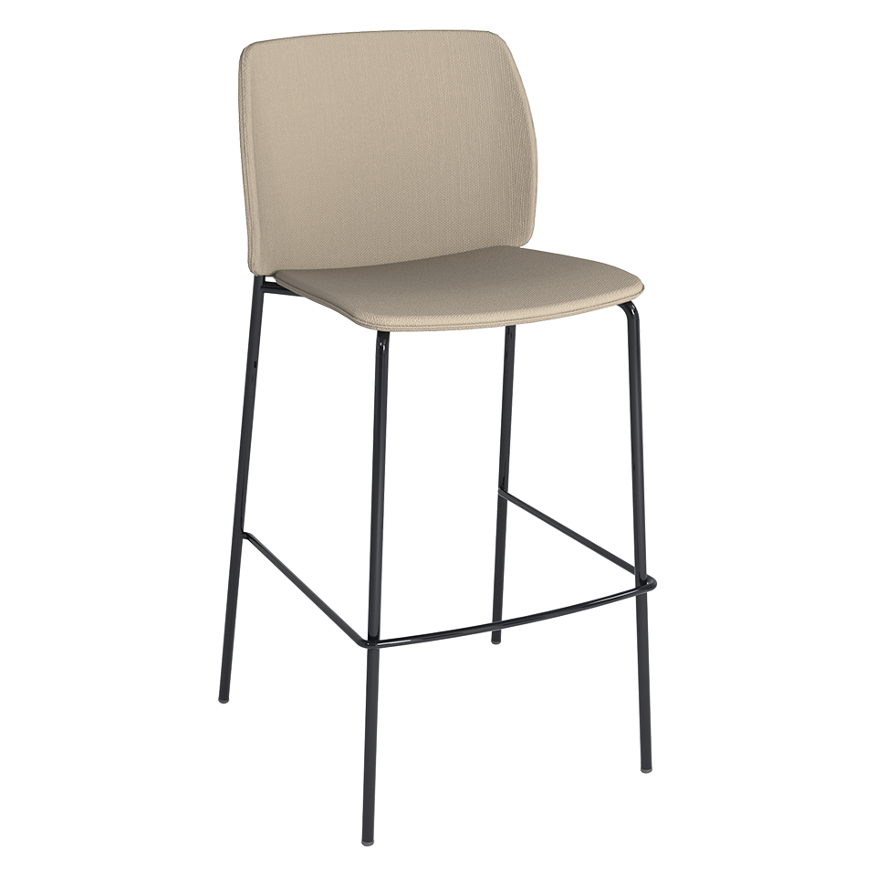 Sustainable, stackable barstool with larger backrest. Epoxy-coated steel frame, upholstered seat and back. Made with 61% recycled materials. Greenguard Gold-certified and 97% recyclable. Available in multiples of 2.