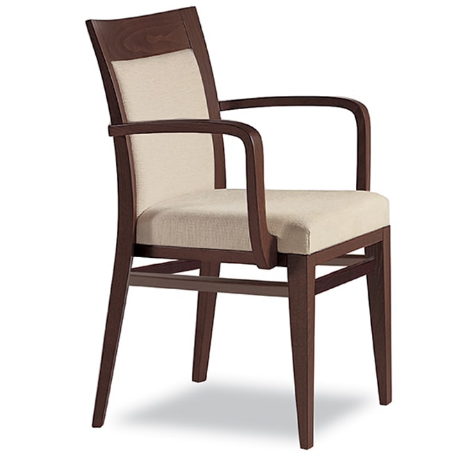 Armchair with full-length backrest, on beech frame and stretchers. Seat and back upholstered. Stacks 8.