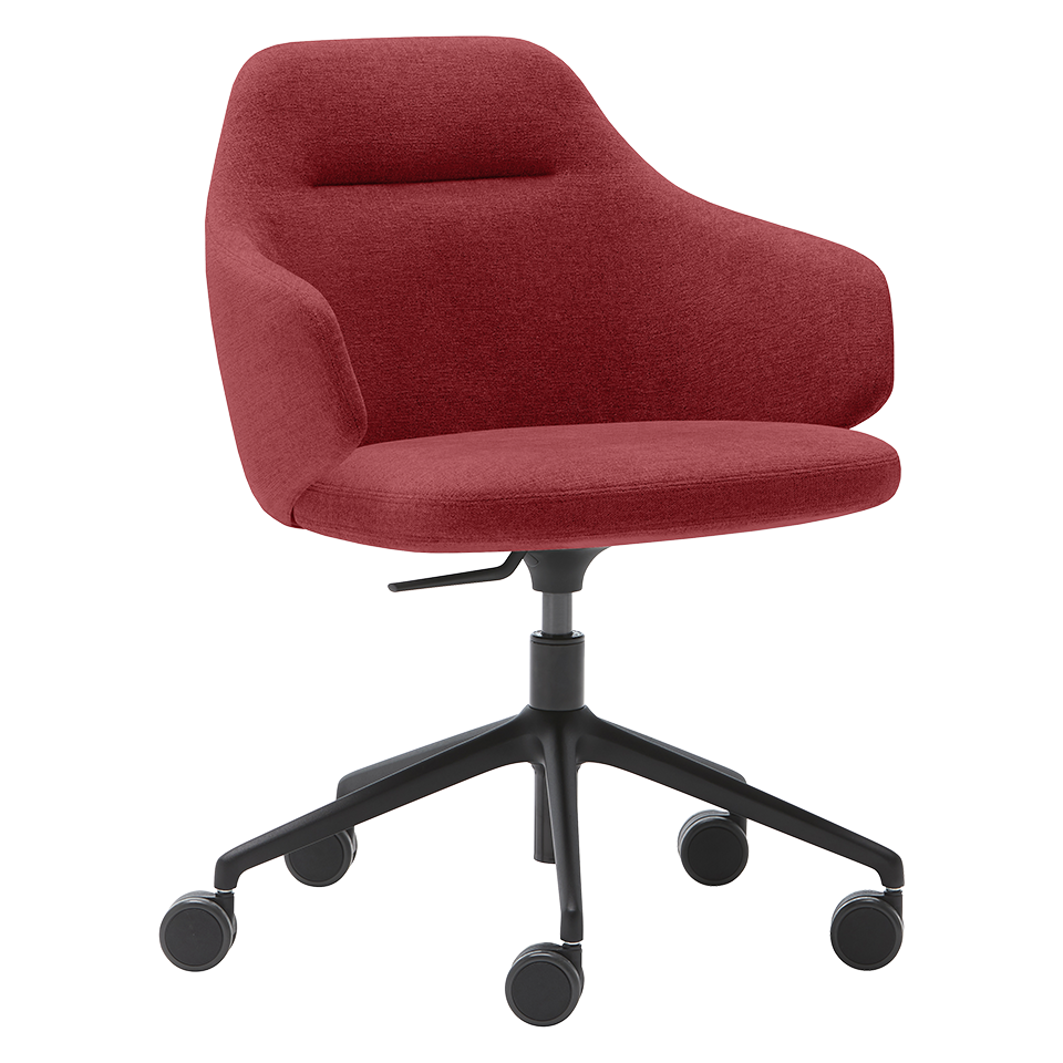 Upholstered armchair with medium backrest. 5-spoke cast aluminum alloy swivel base, with gas lift column, a tilt mechanism and 65mm twin wheel casters, with soft tread. The seat height is adjustable with gas lift column.