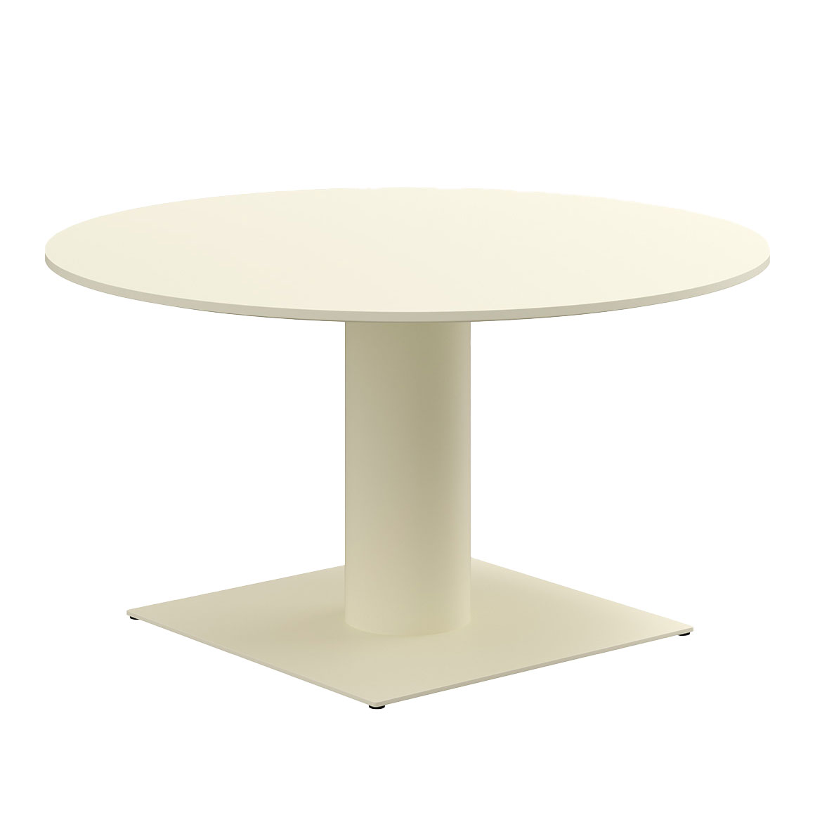 Contemporary MDF table top with high pressure laminate. Features a pillar base with powder coated steel tubing and felt glides.