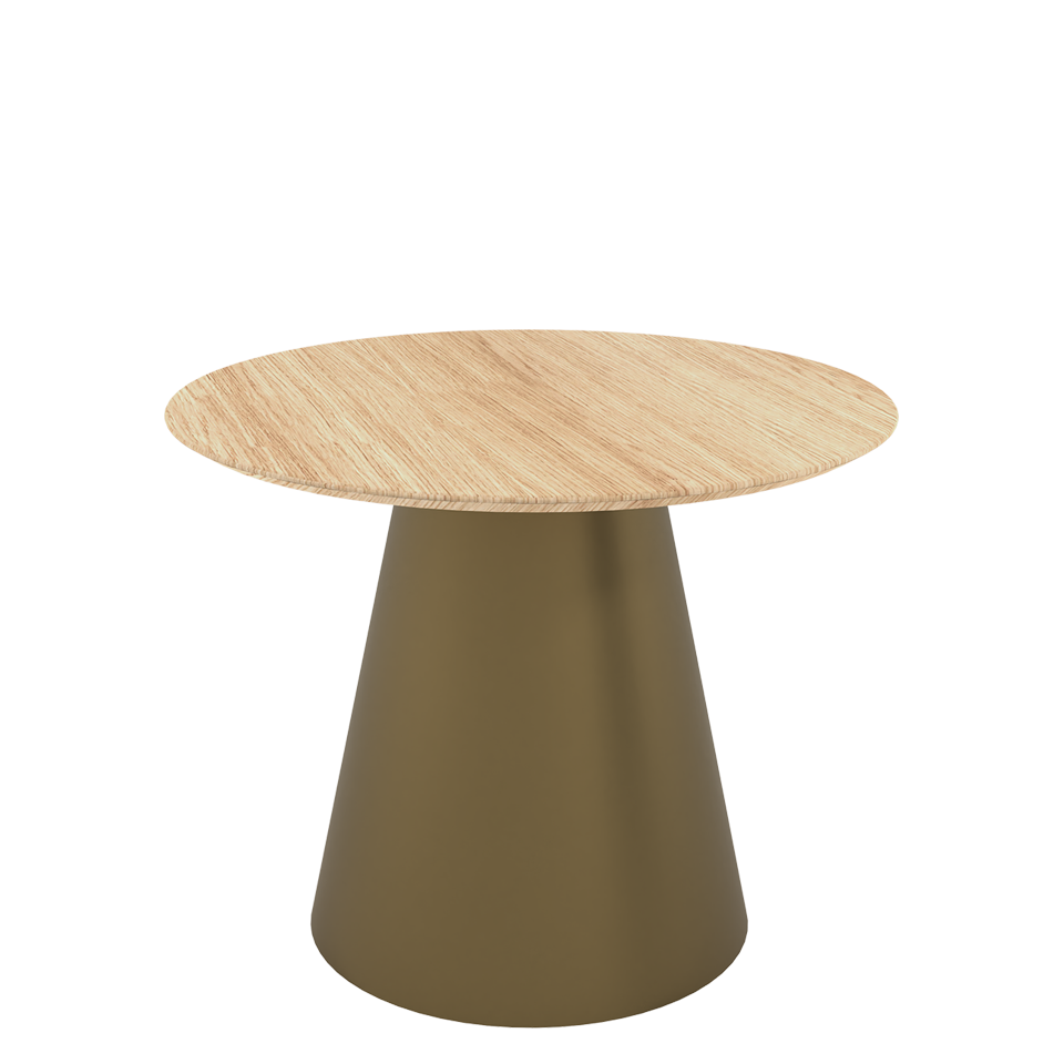Dining table with wider metal base and table top measuring 90cm/36" in diameter. 75cm/29.5" high. The round table top is available in woodgrain or a lacquered finish, with a reverse knife edge profile. Other profiles and materials available by special request.
