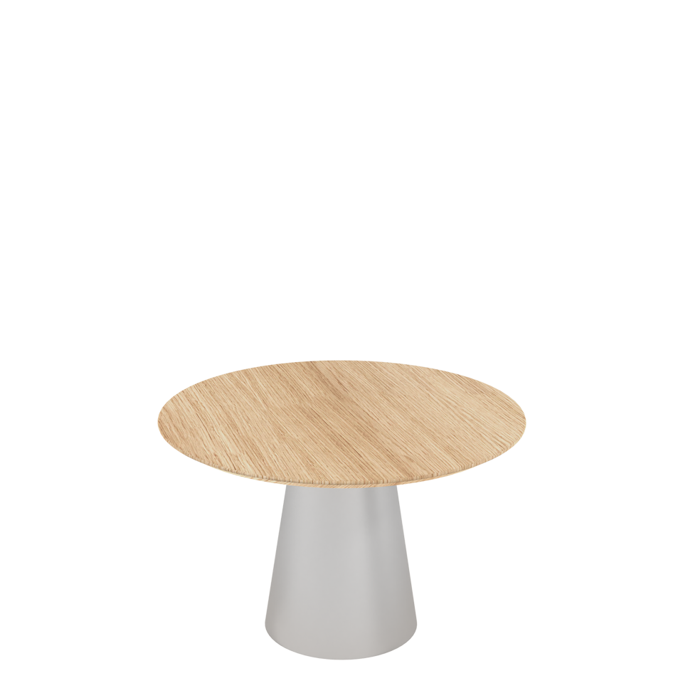Coffee table with conical metal base and 70cm/28"-diameter table top. 45cm/17.75" high. The round table top is available in woodgrain or a lacquered finish, with a reverse knife edge profile. Other profiles and materials available by special request.