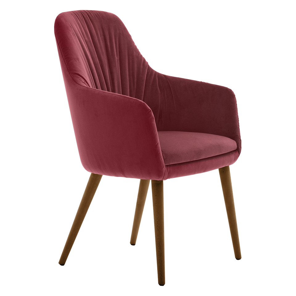 Fully upholstered, high-back armchair with pleated, ruched upholstery on back. Detachable seat on a beech wood frame.