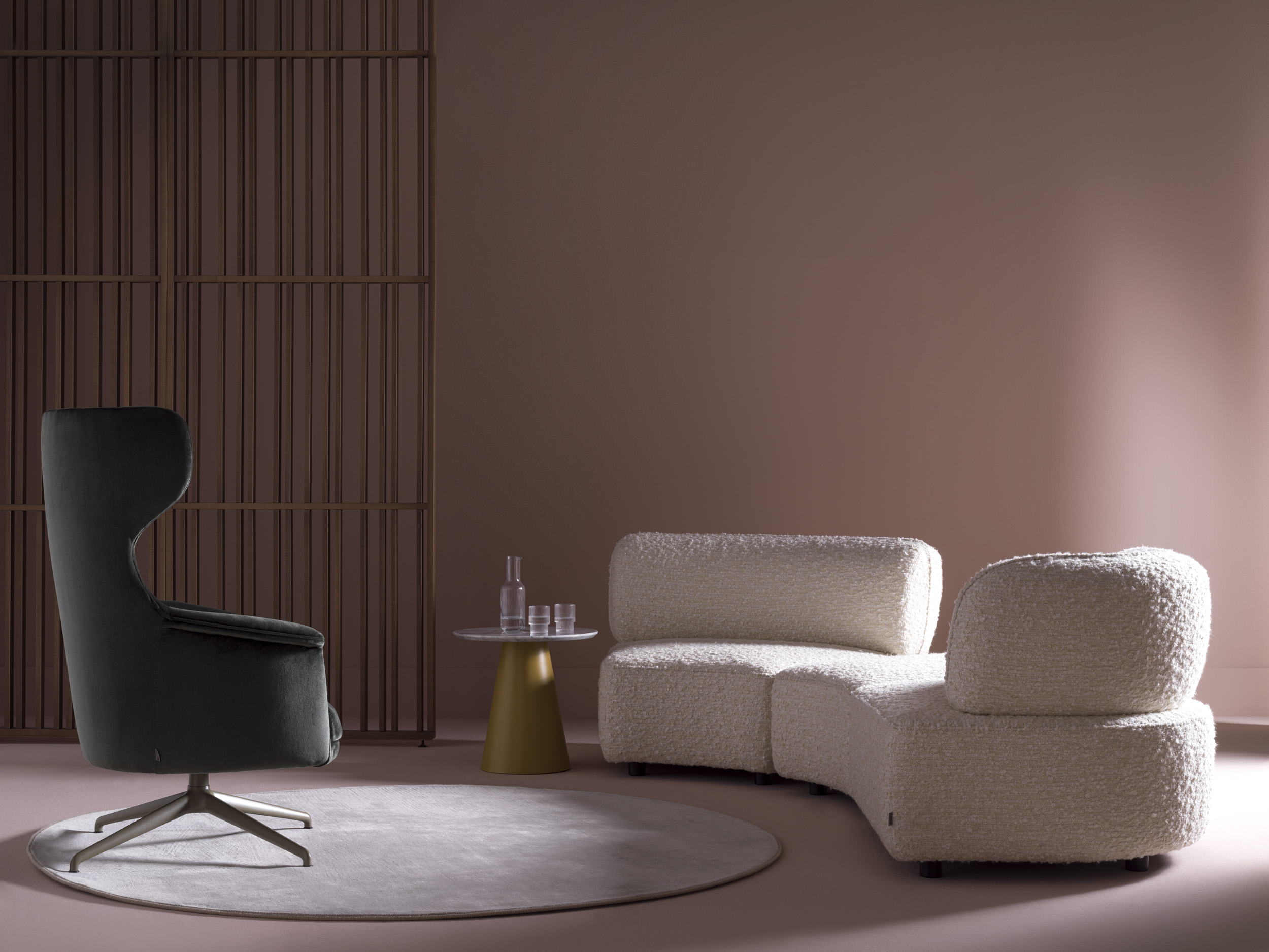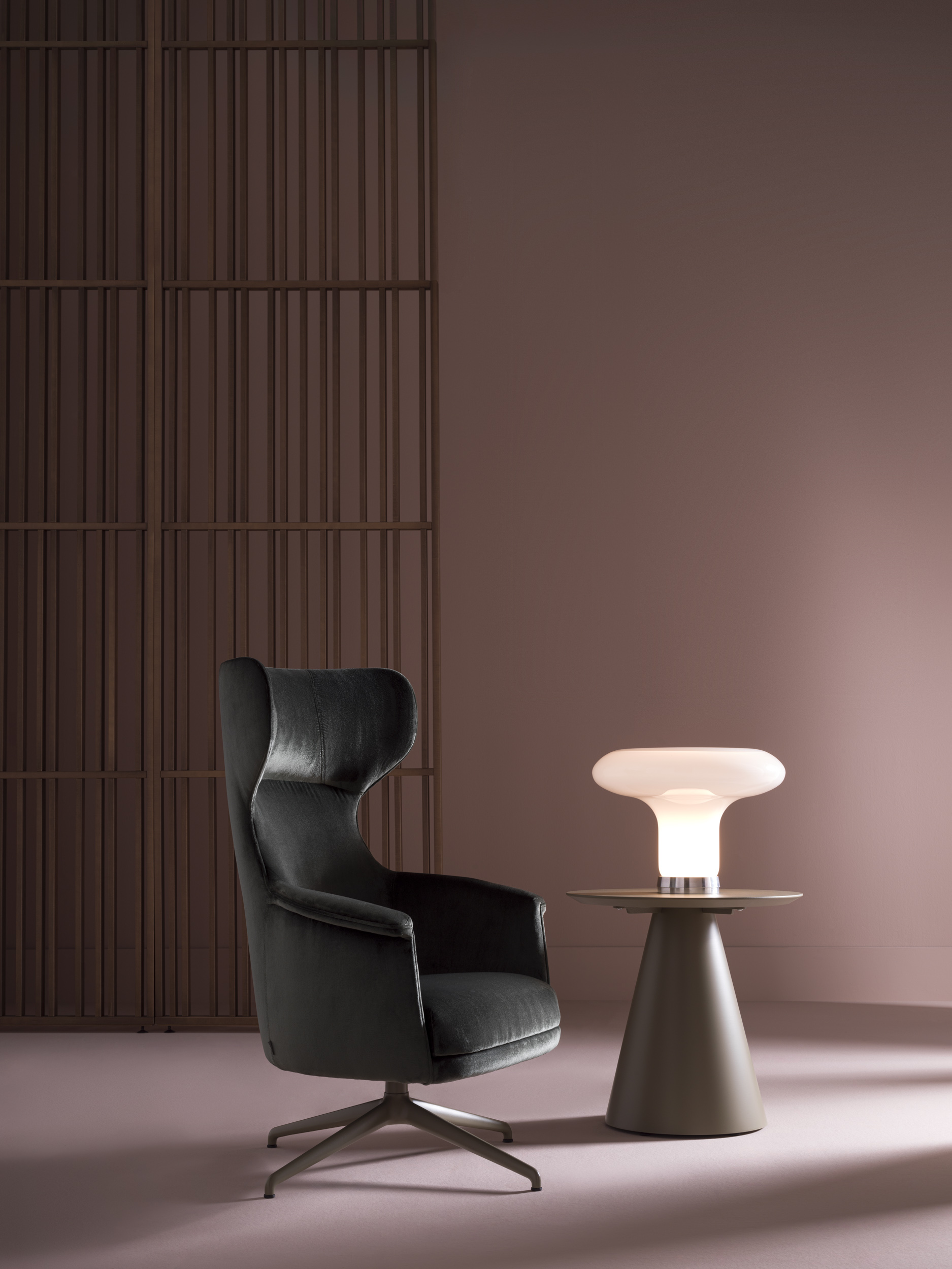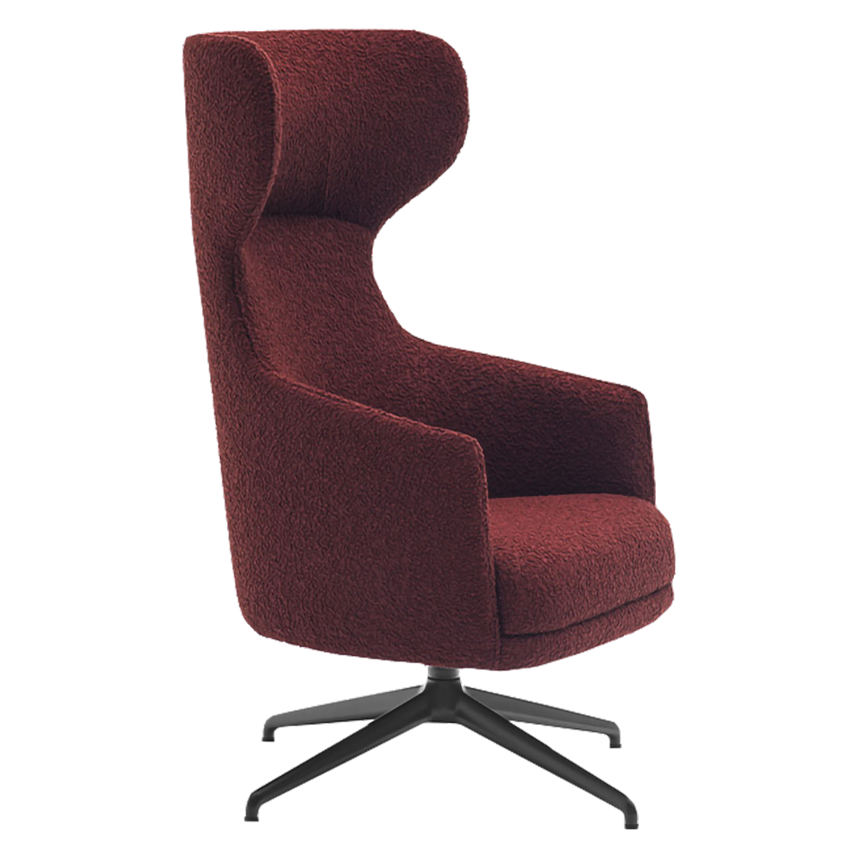 Wing-back lounge chair with aluminum swivel base. Comfortable, supportive backrest and removable seat.