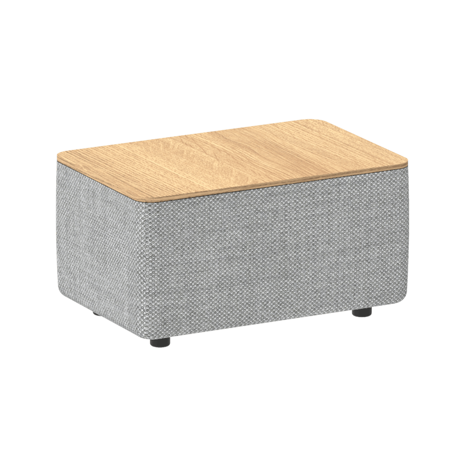 Table with wooden top and upholstered frame fitted with plastic glides.