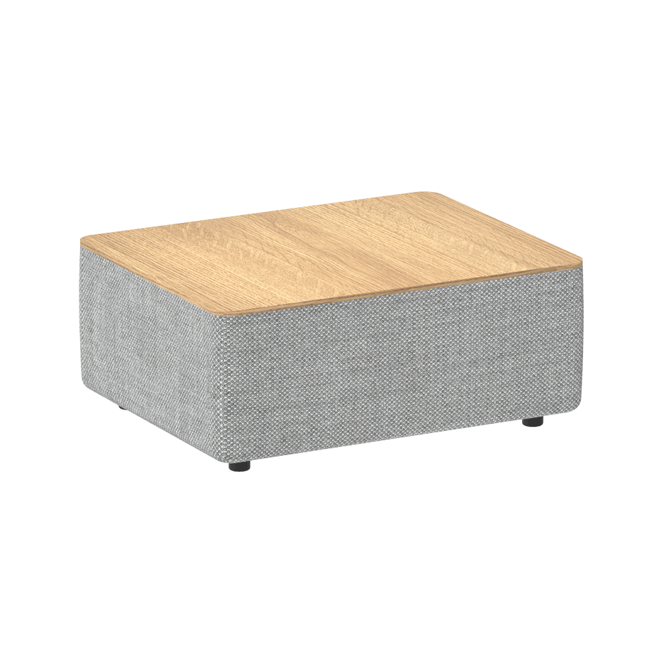 Table with wooden top and upholstered frame fitted with black plastic glides.