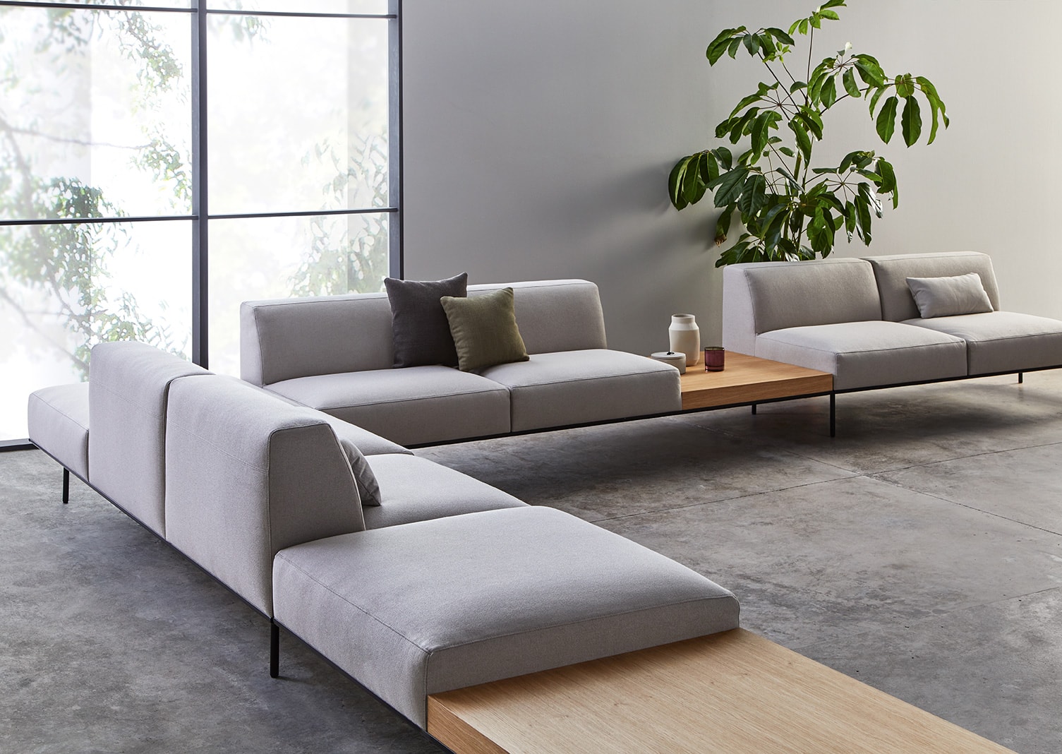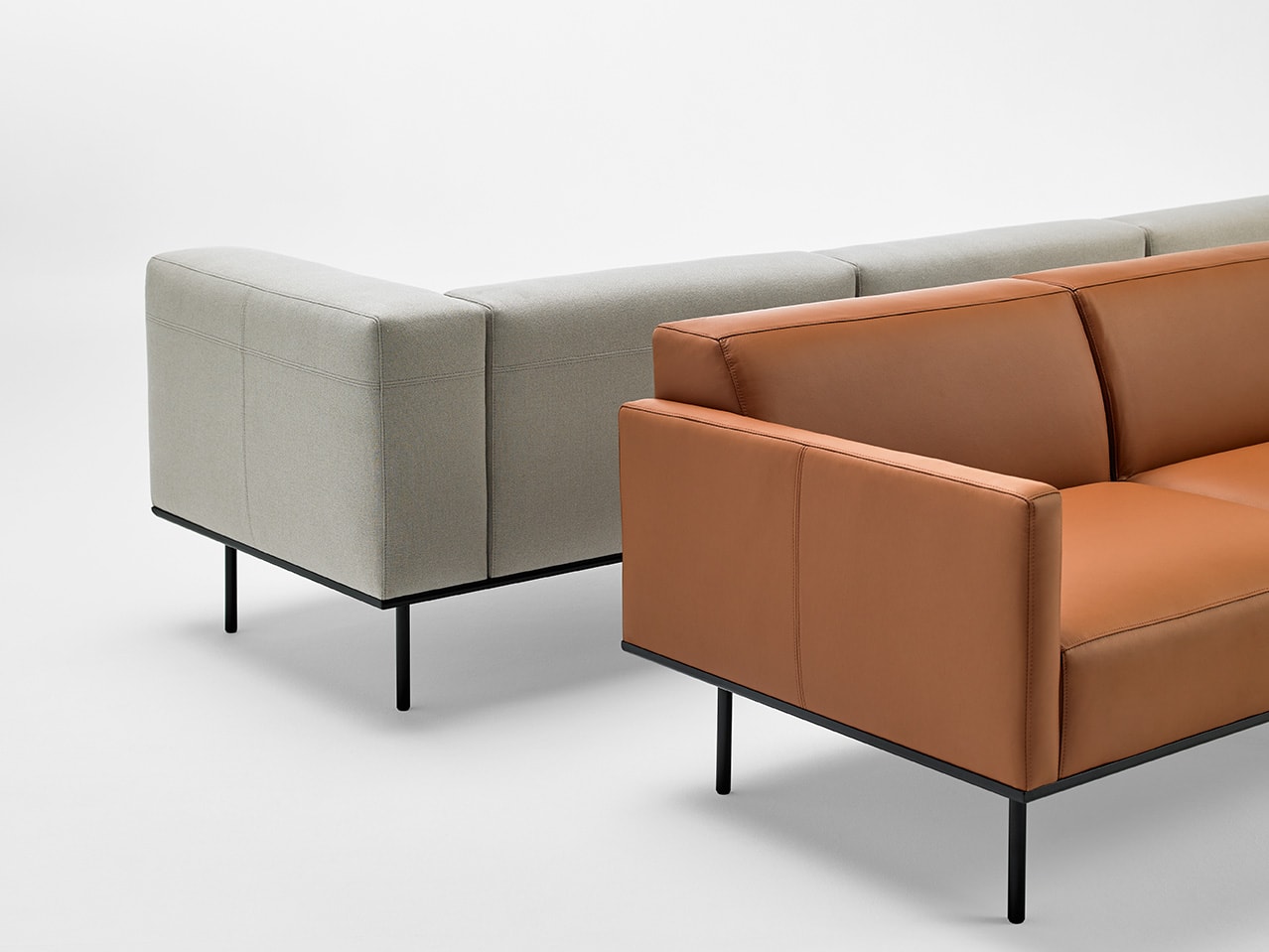 ESCALAS is a flexible modular collection of sofas and benches designed to inhabit modern lounge spaces and waiting environments. The pictured configuration uses three high backrest seats, a central table and two high armrests. Please contact one of our representatives to discover all the configurations offered by this range.