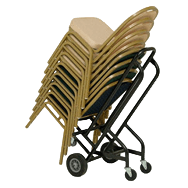 Heavy gauge welded steel frame. Accommodates 4-10 stack of chairs, depending on model. Easy push handle at the back with support, with free standing stabilizing wheels. 2 x 8” semi pneumatic casters.