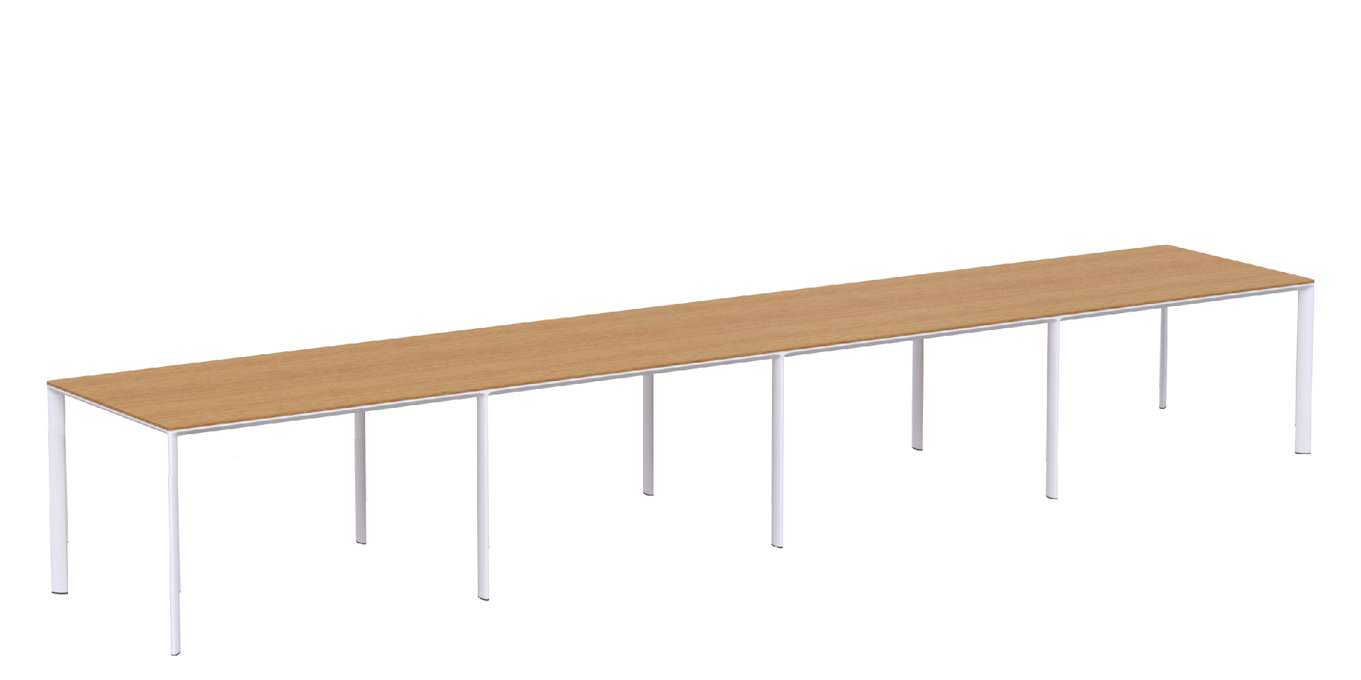 Counter height table with aluminum frame. 640cm x 90cm/252" x 36". This sectional table is composed of four tabletops, with finish options of Fenix, HPL, melamine, lacquer, or oak or walnut veneer. Can be recycled.