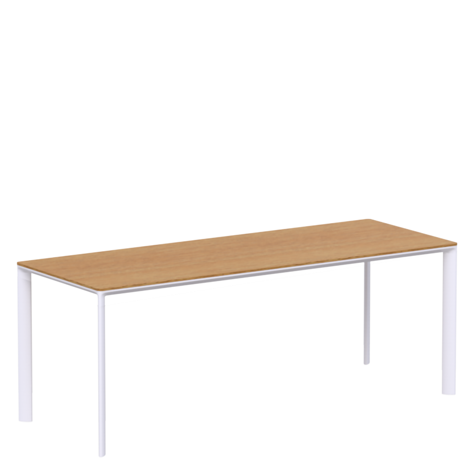Rectangular counter height table with aluminum frame. 200cm x 120cm/79" x 47", with tabletop finish options including Fenix, HPL, melamine, lacquer, or oak or walnut veneer. Recyclable. See below for epoxy colors and accessory options.
