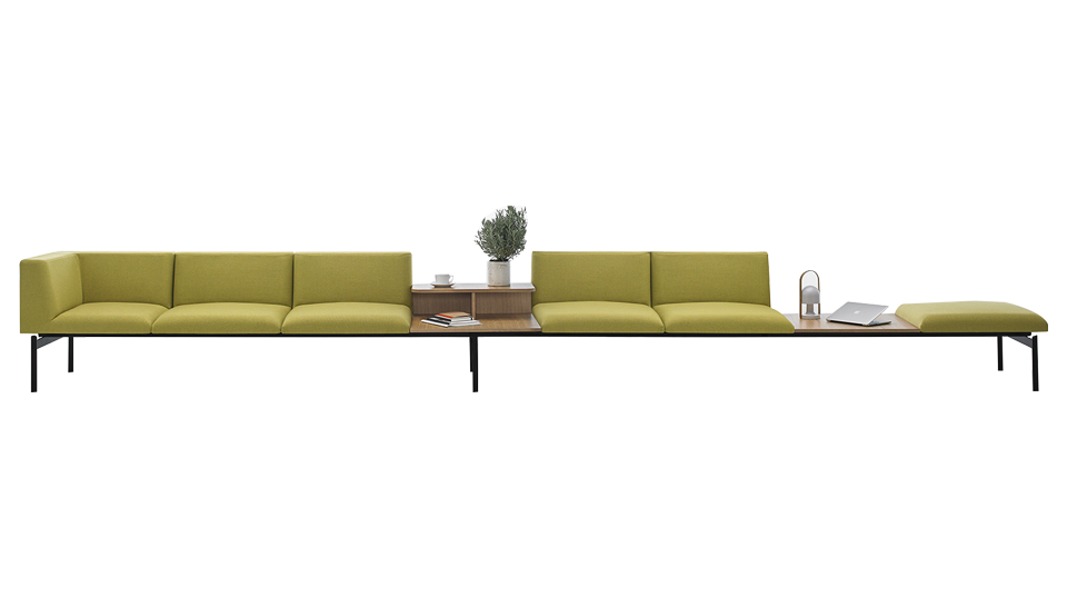 LAPSE is a comprehensive modular program that transcends the classic concept of seating for waiting areas. The broad range of elements and accessories available and the special design of the modules allow endless compositions to be configured. The pictured configuration uses a three and a five seater frame with four high backrest seats, one corner unit, two tables in oak veneer and a seat without backrest. Please contact one of our representatives to discover all of Lapse’s possible configurations.