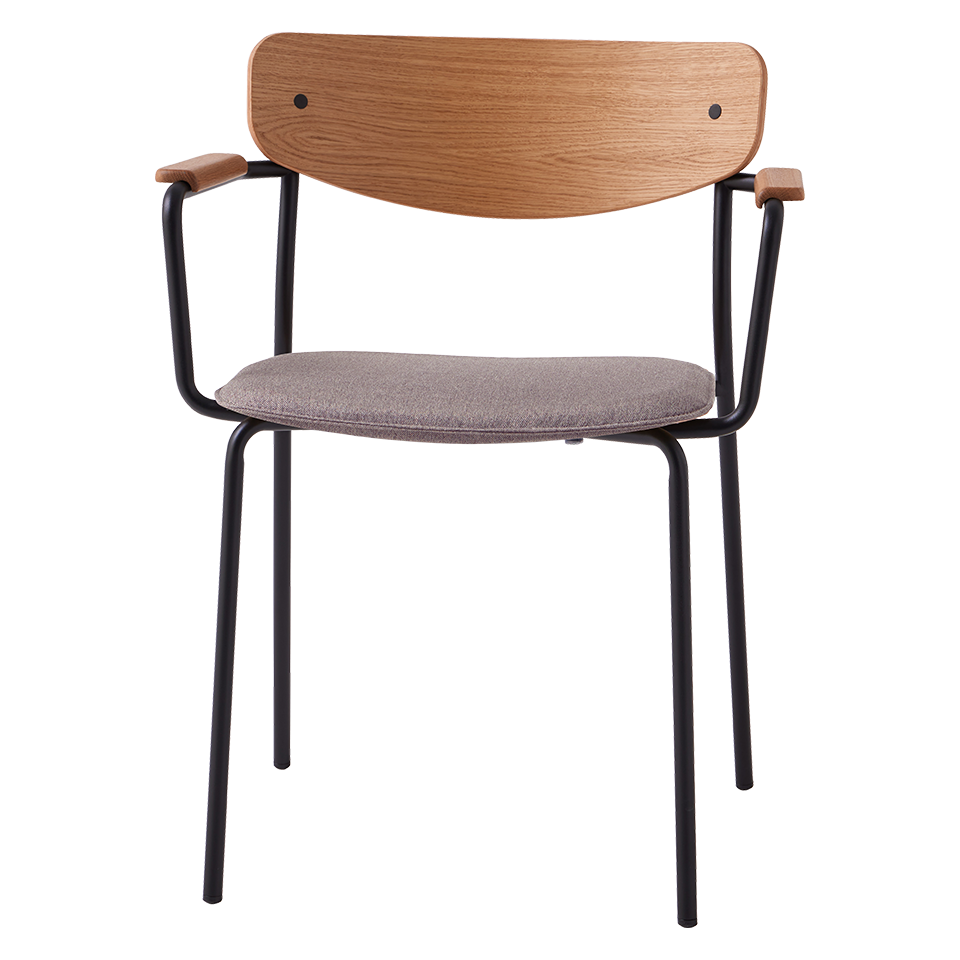 Stackable armchair with upholstered seat, plywood back and armpads in solid oak. Four leg frame with arms in round steel tube.