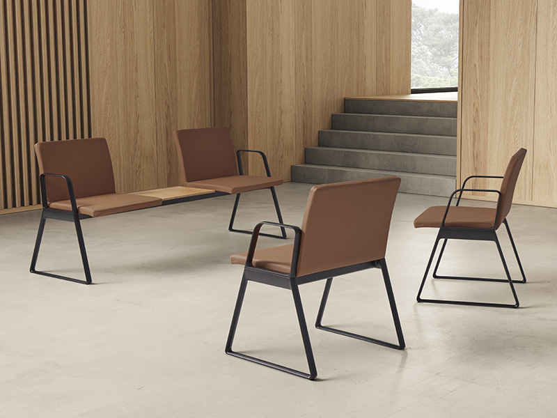 Customisable bench system available with fully upholstered seats and wooden tables. Aluminum structural frame with 2 legs and sled base.