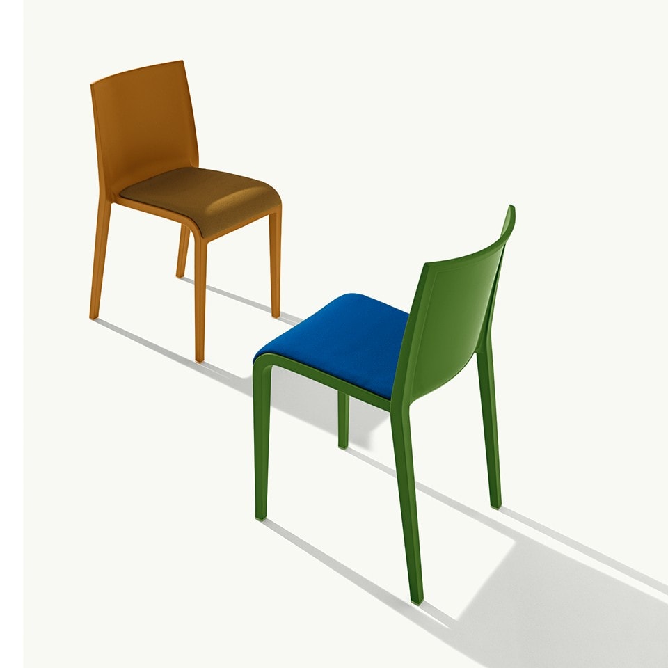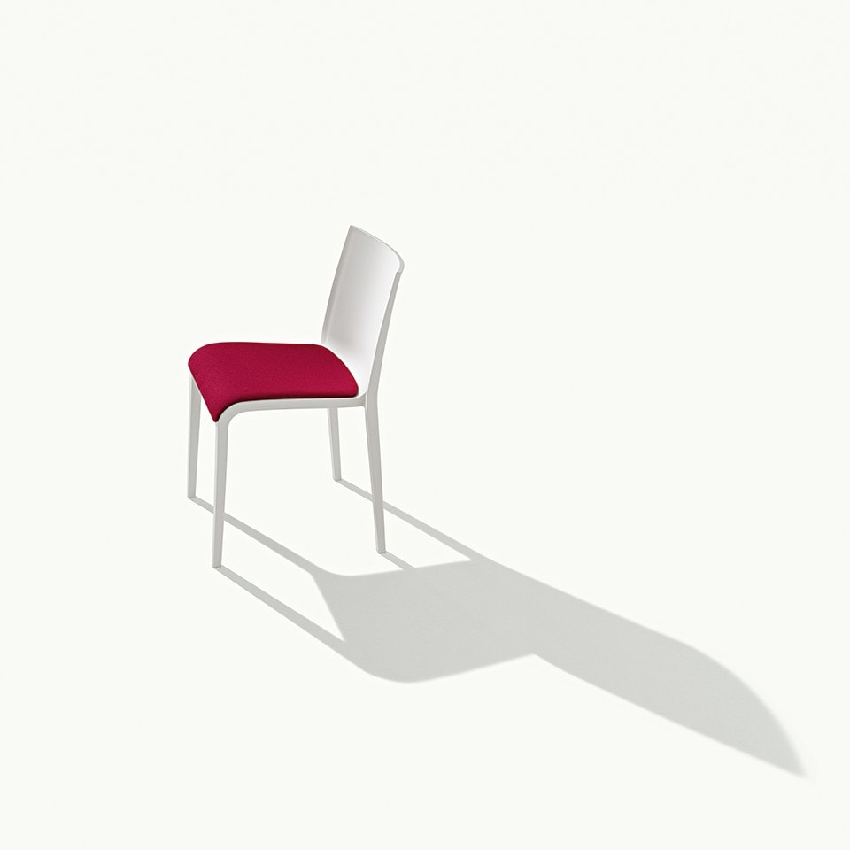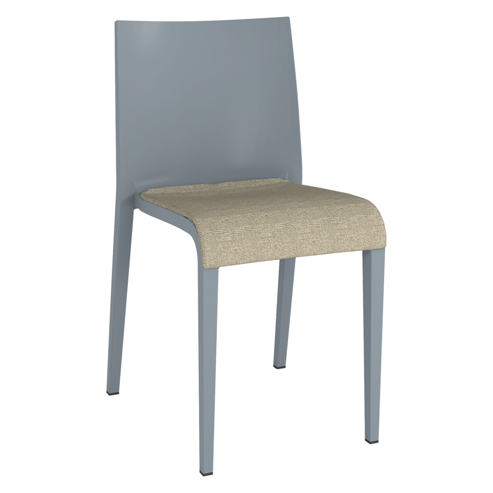Air molded polypropylene chair with upholstered seat, stacks 4 high.