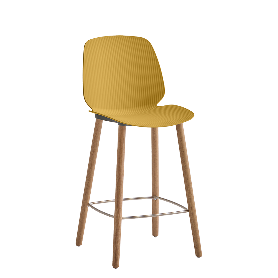 Counter stool with wood legs and a ridge polypropylene seat that features a non-slip texture. FSC-certified oak wood, Greenguard Gold-certified.