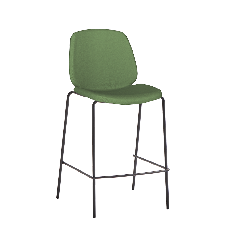 Stackable counter stool with fully upholstered shell seat with a distinctive silhouette. Steel legs, Greenguard Gold-certified.