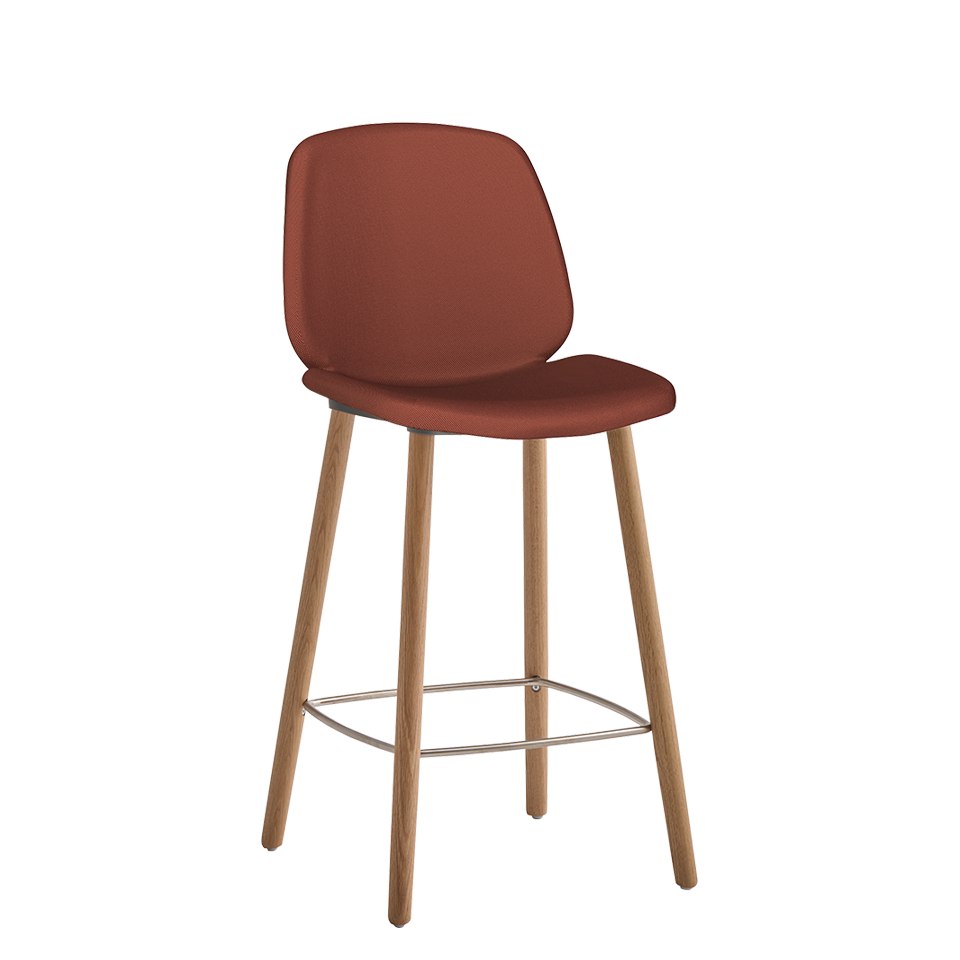 Fully upholstered counter stool with wooden legs. Greenguard Gold-certified to have a minimal impact on indoor air. The oak wood is FSC-certified, and the footrest is steel with a chrome finish.
