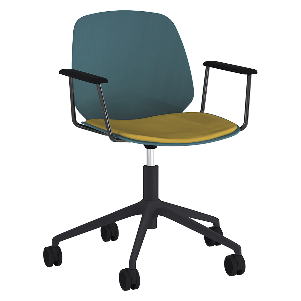 Height-adjustable task chair with armrests and seat pad. Aluminum swivel base with caster wheels. Greenguard Gold-certified.