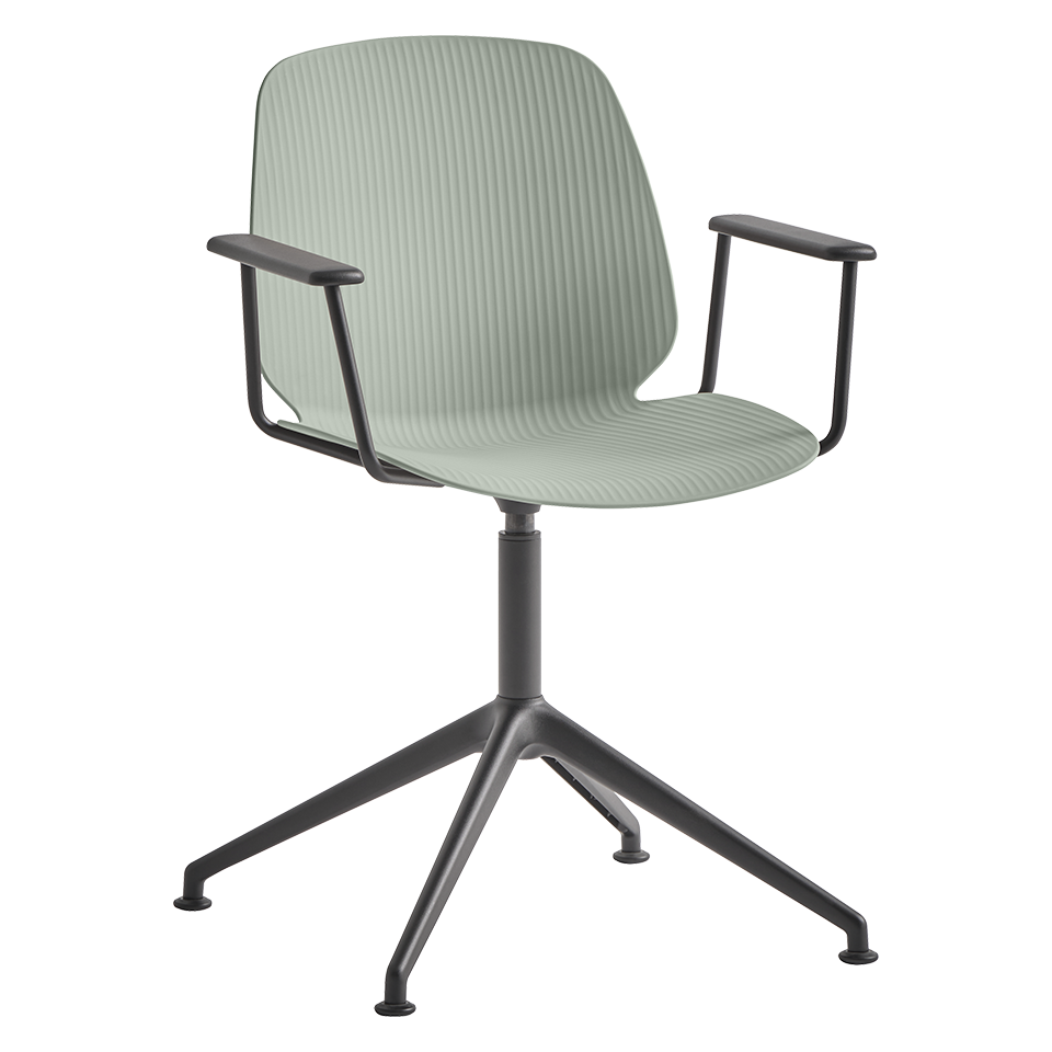 Swivel task chair on a 4-spoke aluminum base, with armrests. Not height-adjustable. The polypropylene seat has a non-slip texture. Greenguard Gold-certified.