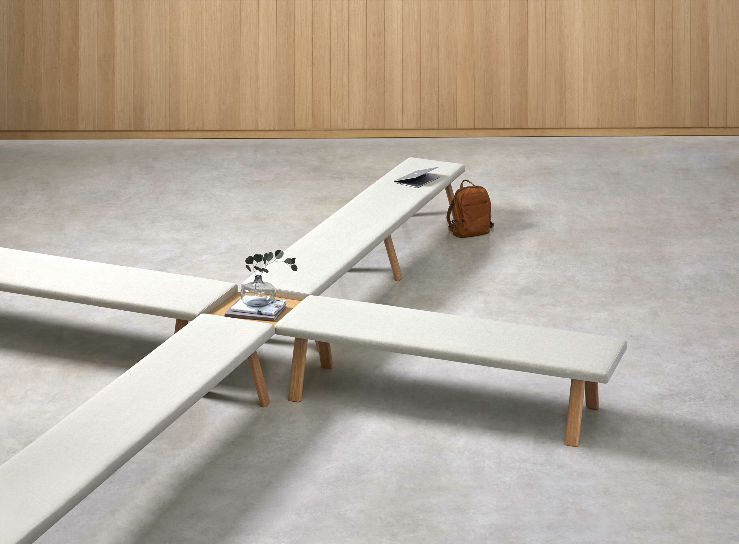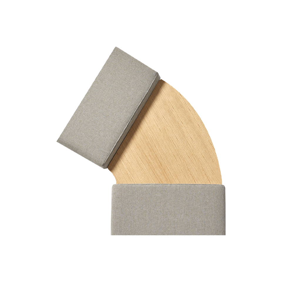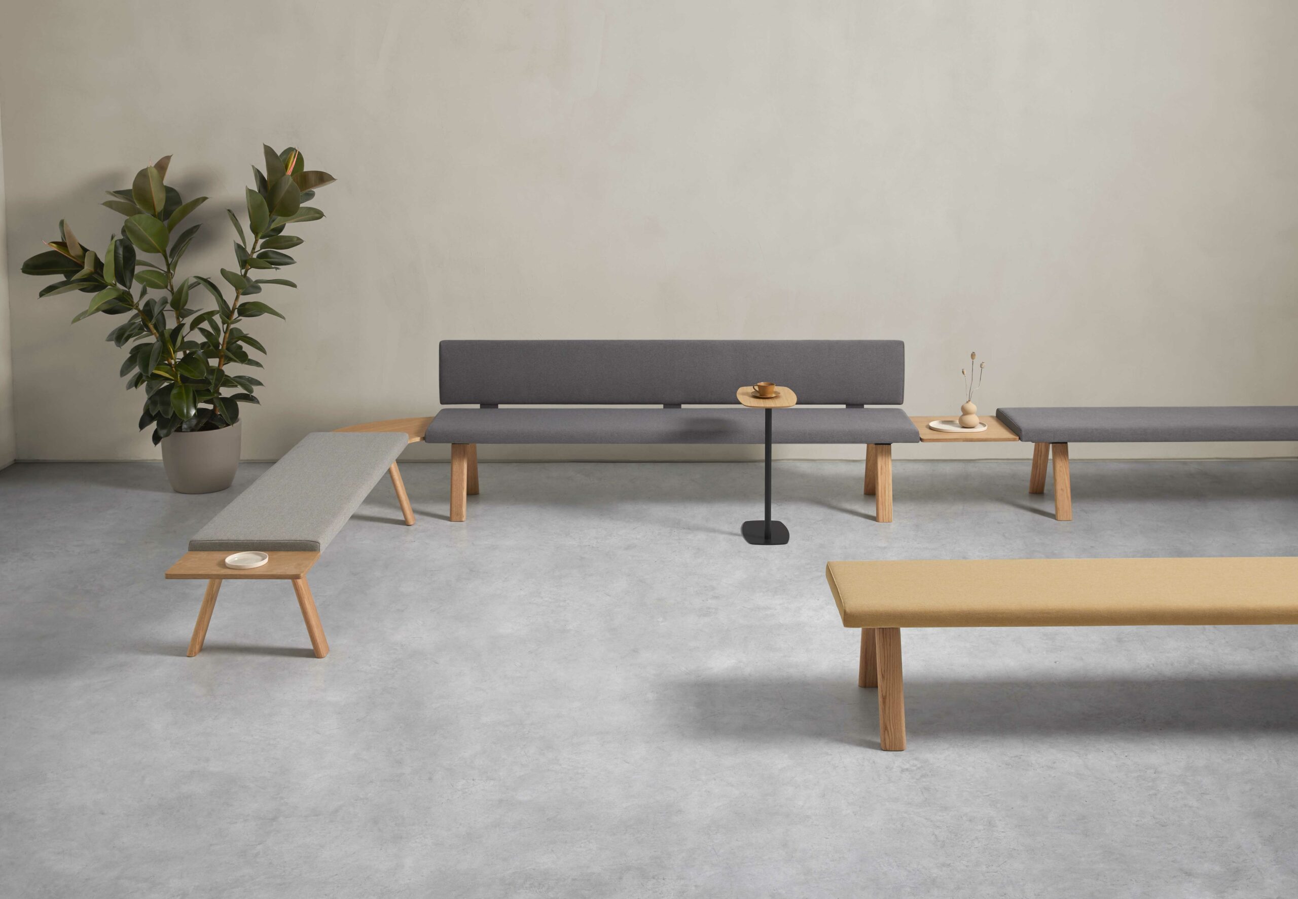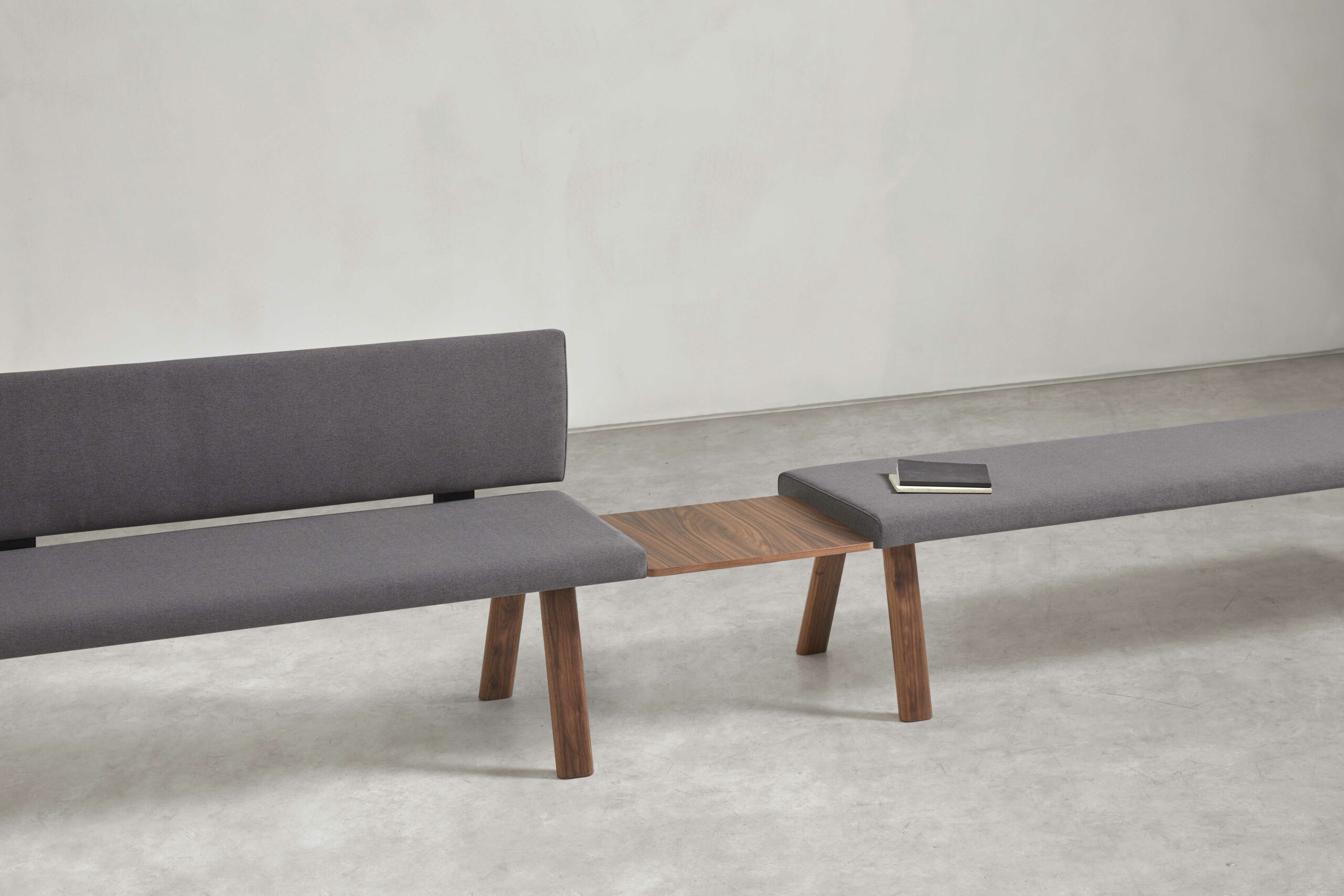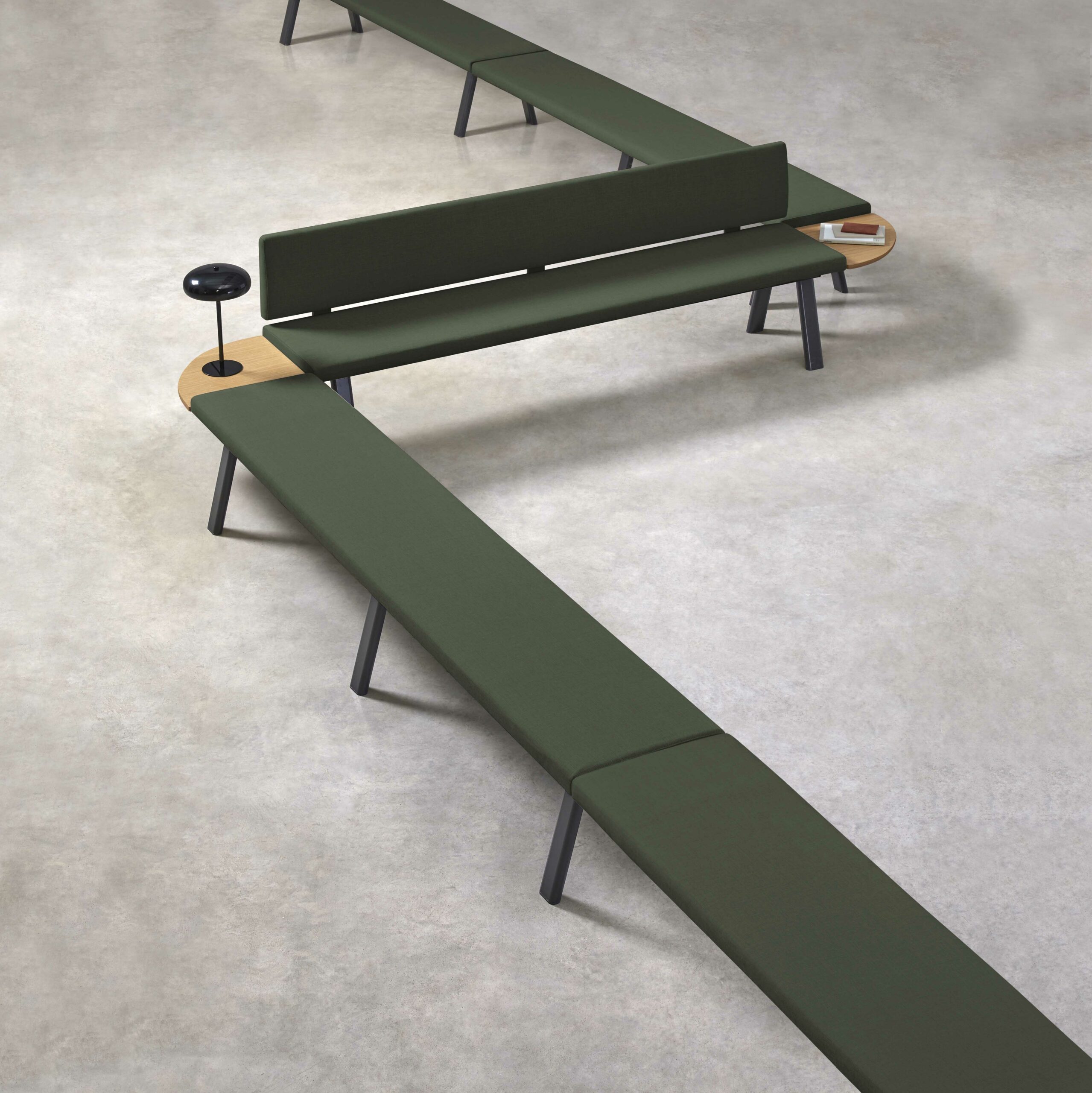 Plania corner connecting top in oak, walnut, HPL and Fenix, with structural steel frame to connect 2 benches at 60° angle. Functional 2 ways. To be used with the Plania Bench range.