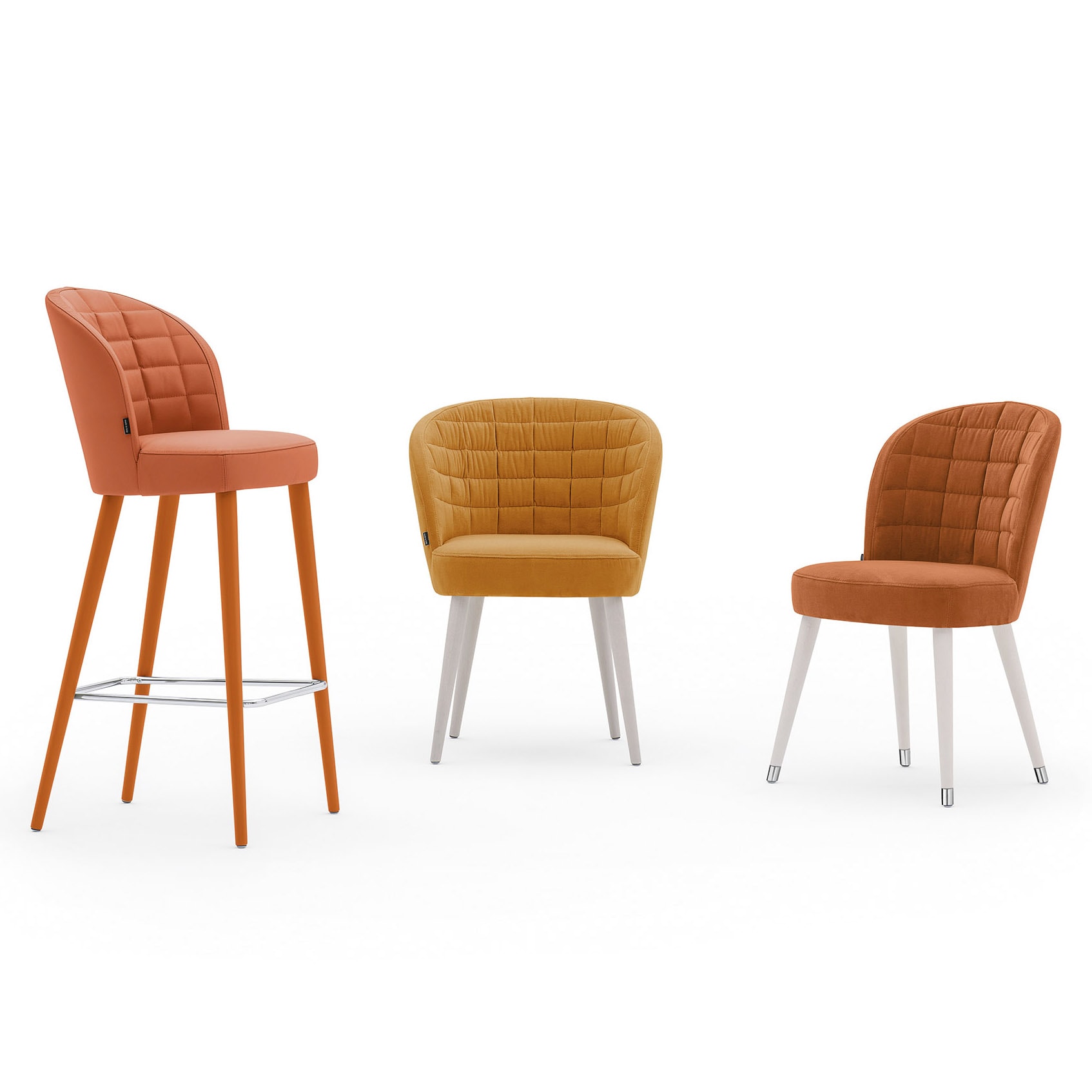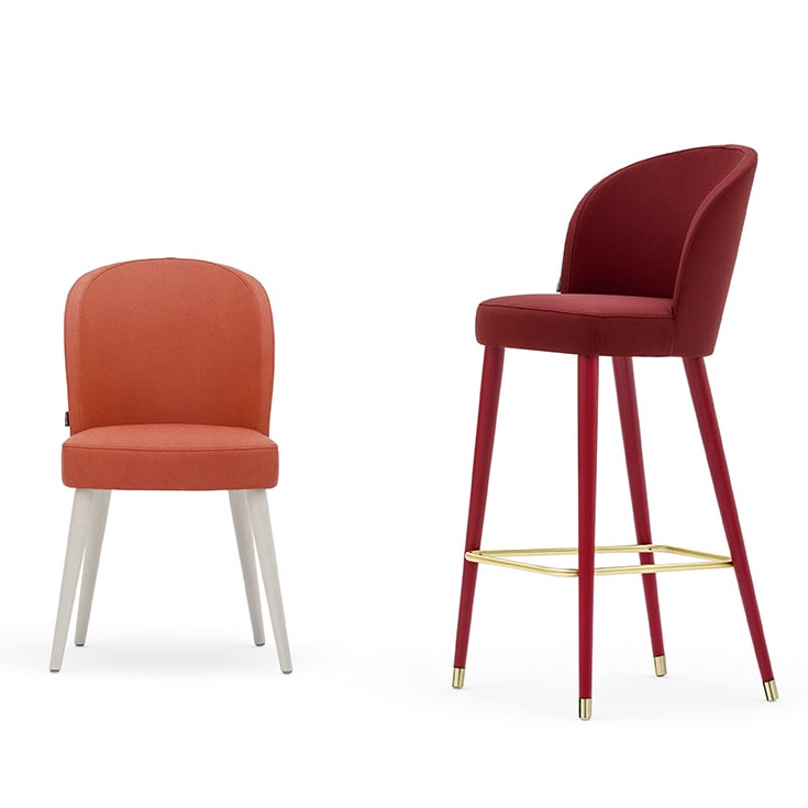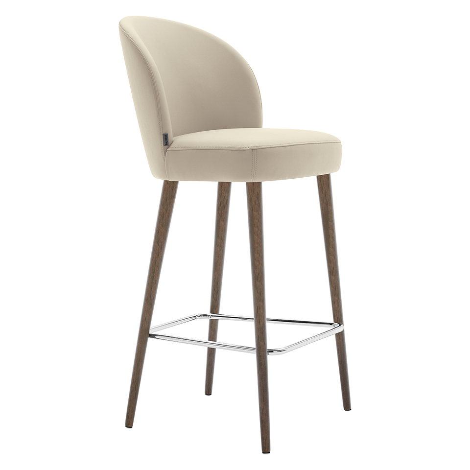 Upholstered barstool with plain upholstery on solid wood frame. Footrest in chrome or brass.