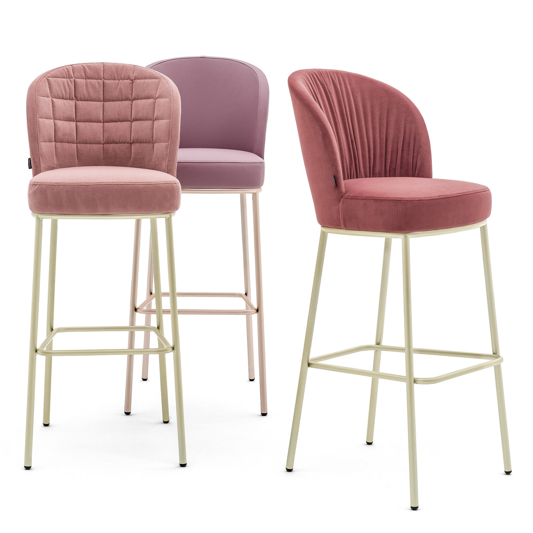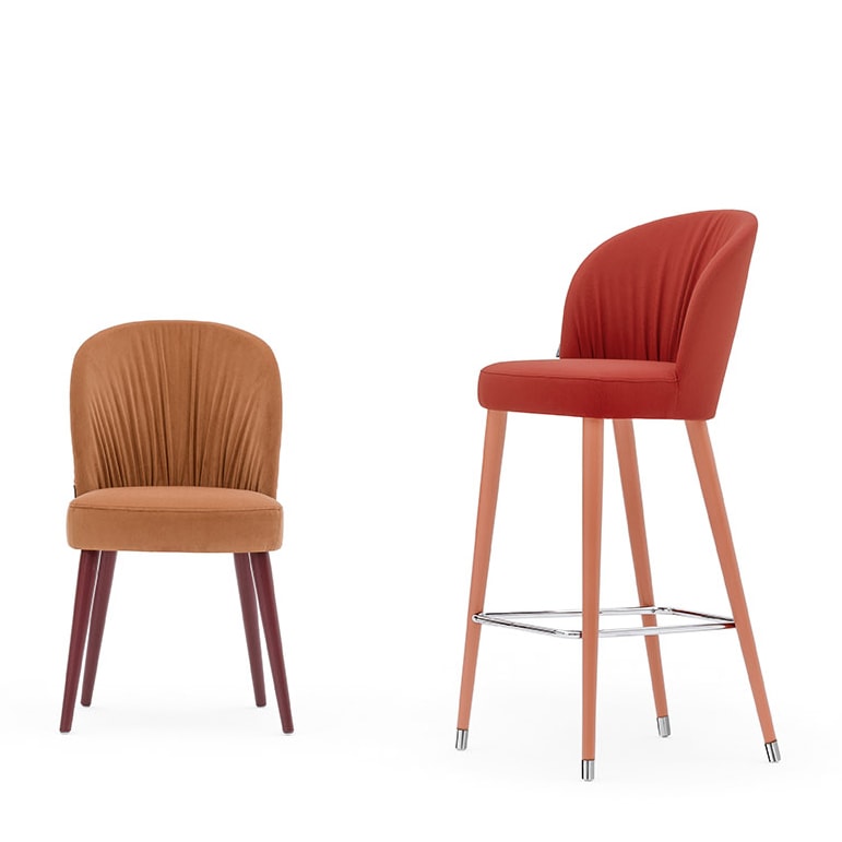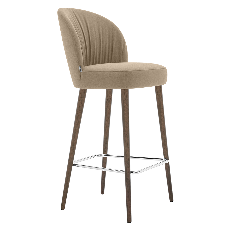 Upholstered barstool with pleated upholstery on solid wood frame. Footrest in chrome or brass.