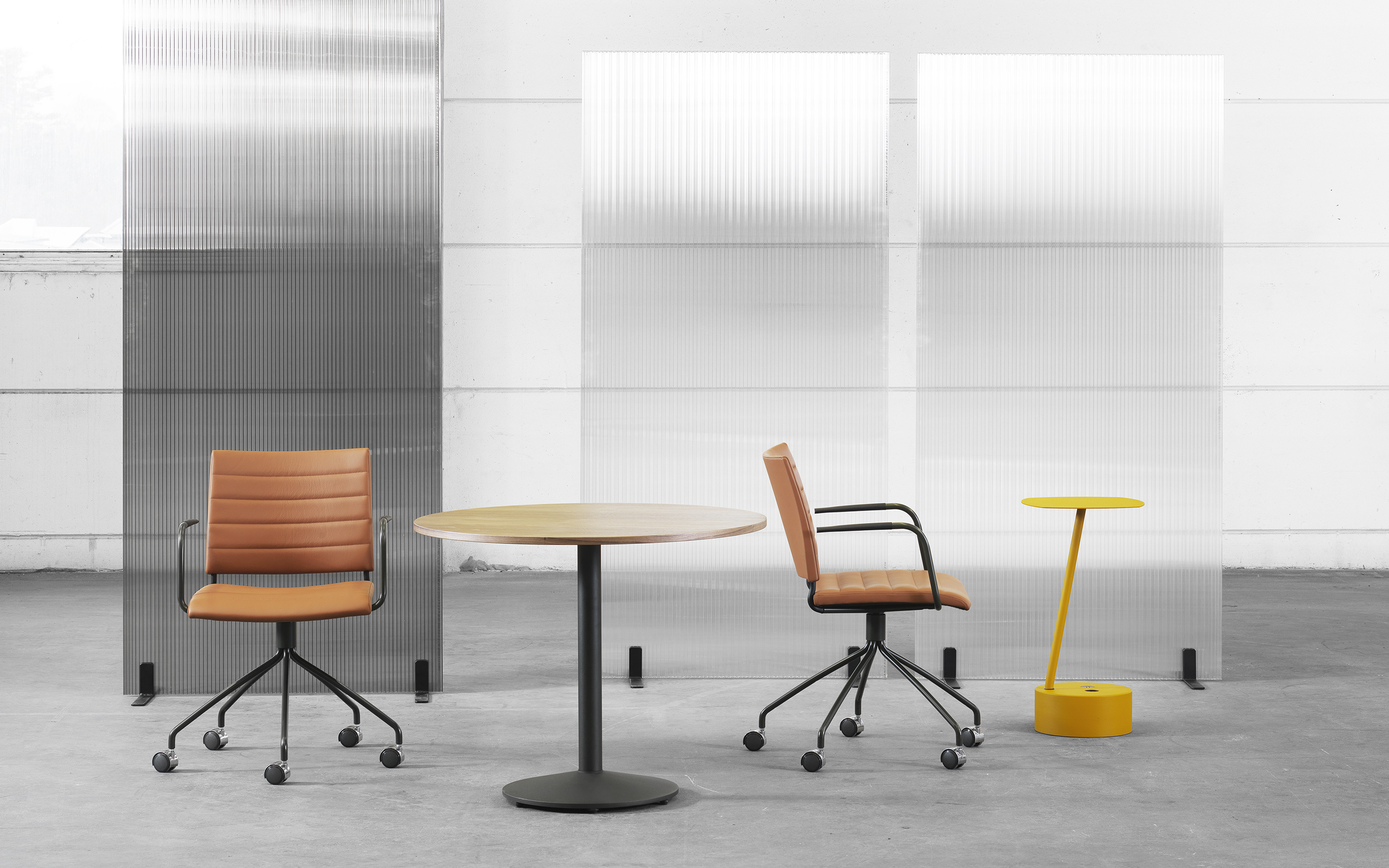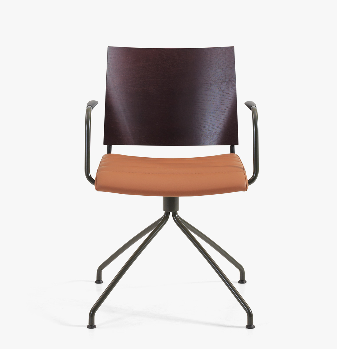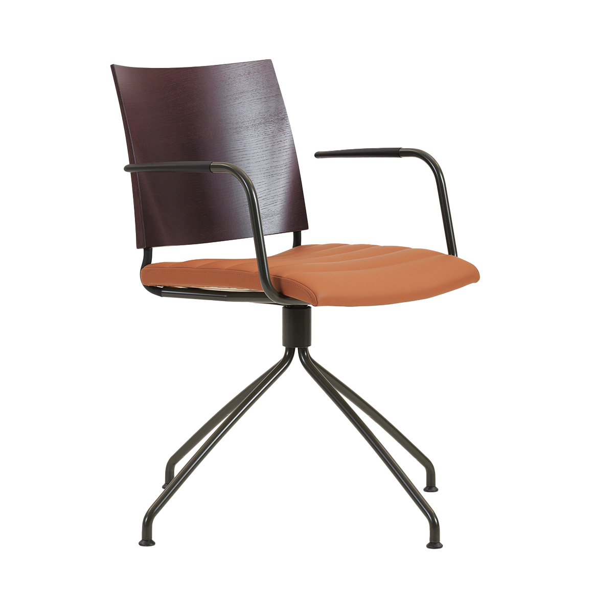 360° swivel armchair with upholstered seat and wooden back on a powder coated or chromium plated tubular steel frame 4 leg frame.