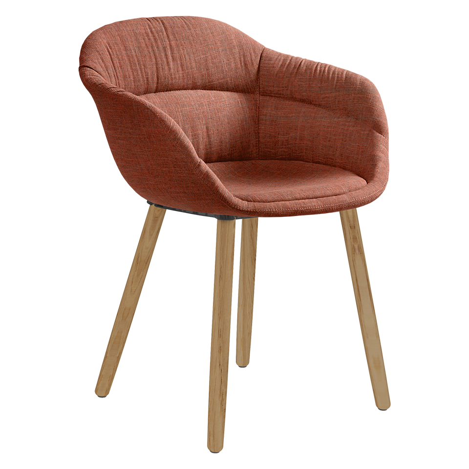 Armchair with soft upholstered shell and 4 leg base made of solid oak reinforced with an inner steel structure.