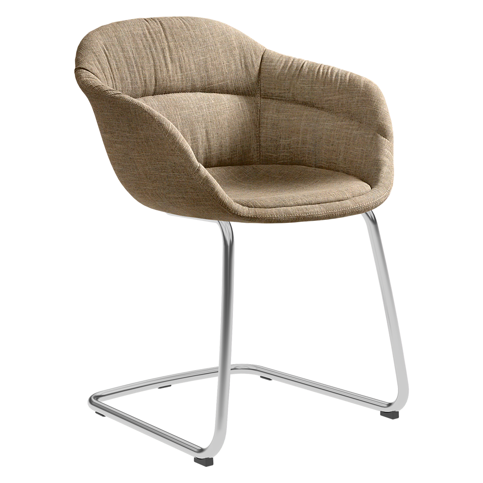 Armchair with soft upholstered shell. The frame is made of round steel tubing and forms a cantilever base.
