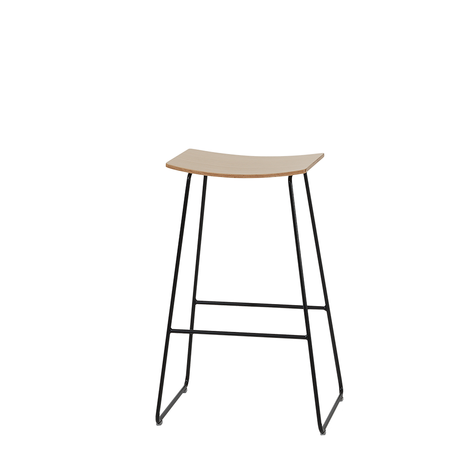 Barstool with steel sled frame finished in chrome or epoxy, and curved seat in lacquered or stained beech / oak.