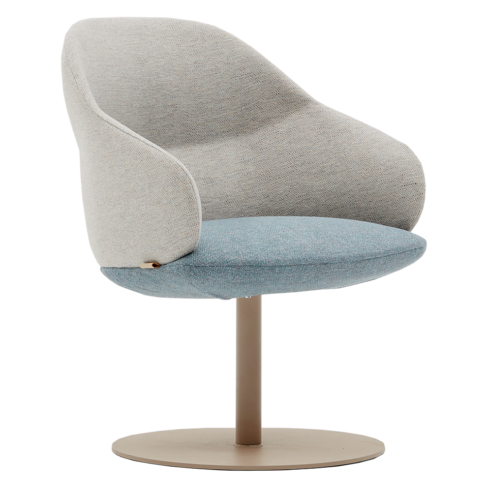 Fully upholstered armchair with ergonomic back support. Pedestal base.