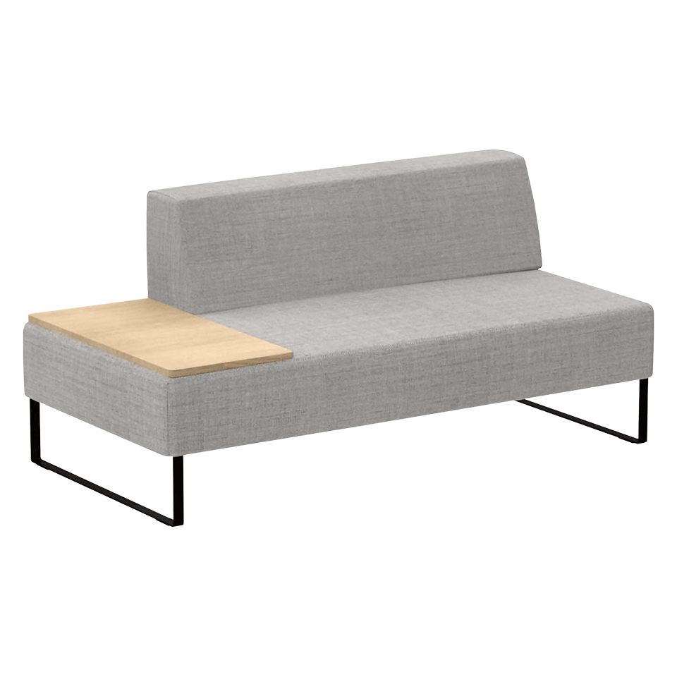 Upholstered modular seat 160cm / 63" with upholstered left side backrest 120cm / 47.2", right side table 40cm /15.7" in oak or lacquered finish and epoxy steel plate legs.