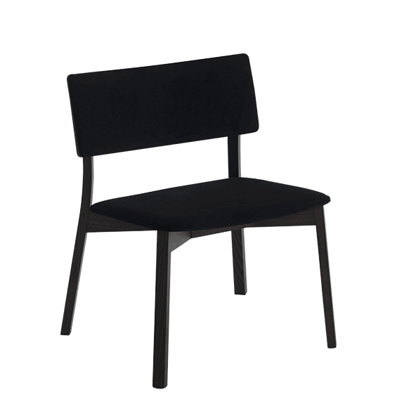 Lounge chair with upholstered seat, wooden back and upholstered back panel on a solid beech frame.