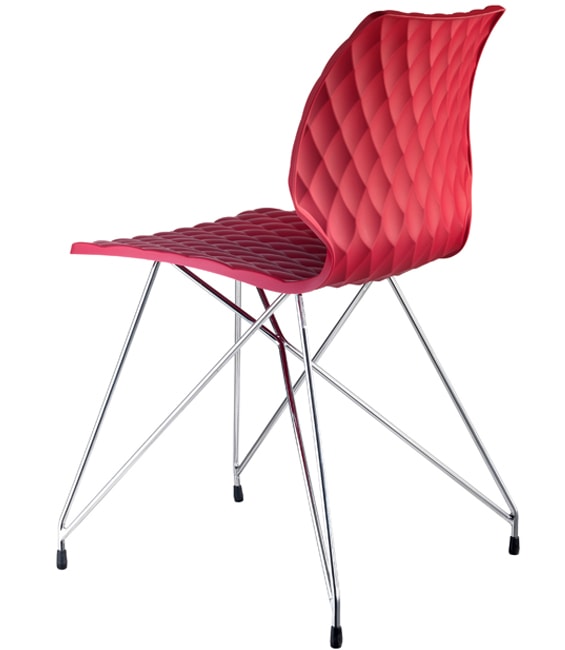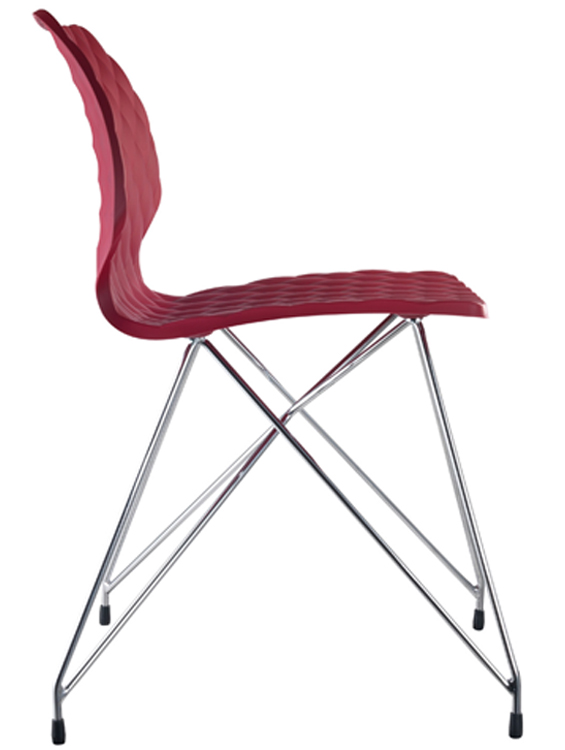 Side chair with seat in polypropylene, on steel base. Front of seat has padded-effect texture, while the back appears in a glossy finish. Meets BIFMA X 5.1 strength test.