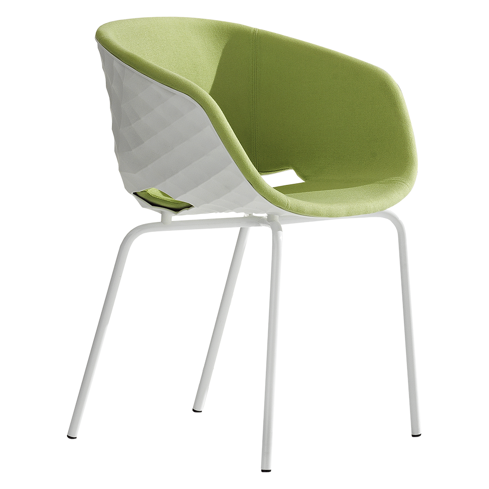 Armchair with upholstered seat on 4-legged steel frame. Polypropylene outside back with matt finish, padded-effect texture.